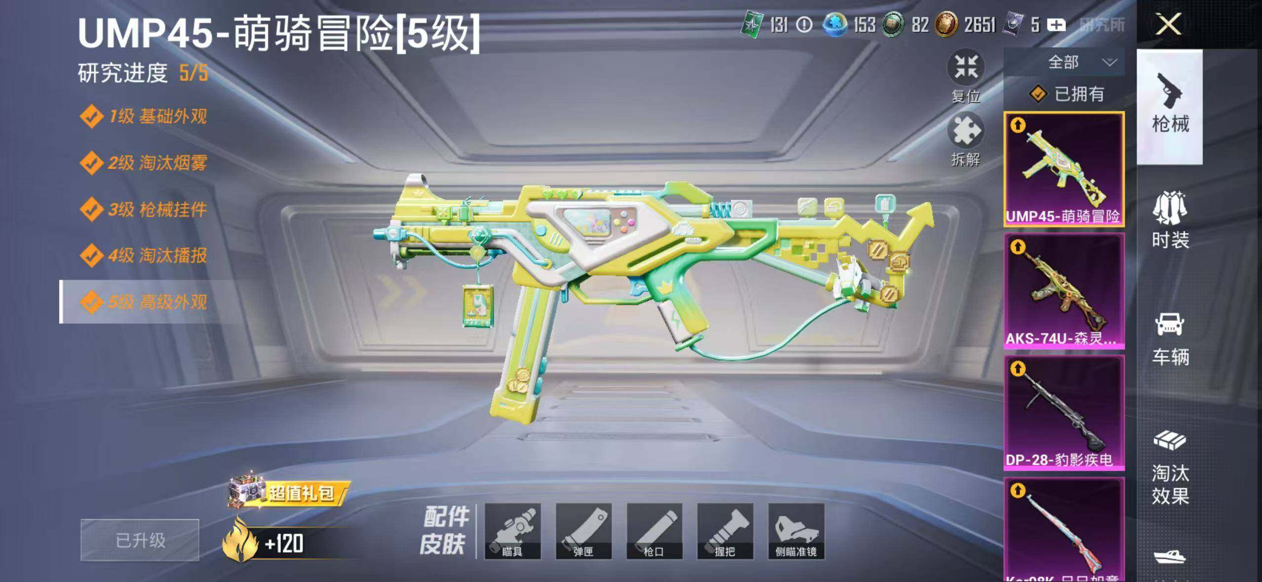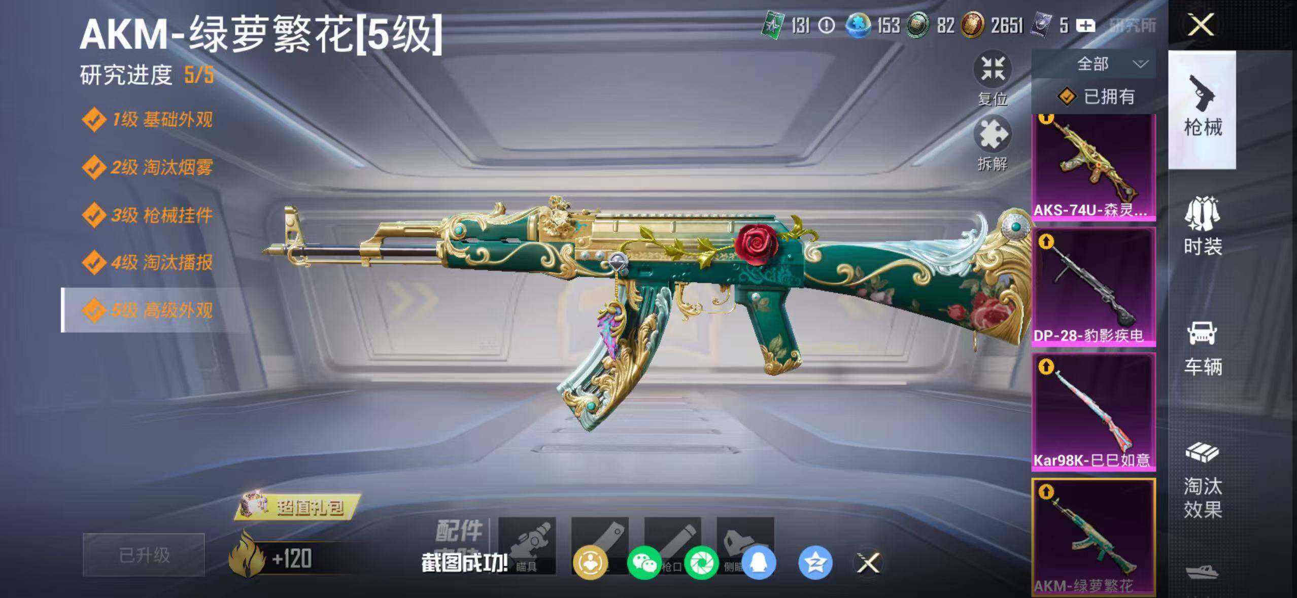【粉色枪皮等级】:AKM-绿萝繁花(五级),UMP45-萌骑冒险(五级),AKS-74U-森灵之息(五级),Kar98K-巳巳如意(五级),DP-28-豹影疾电(五级)