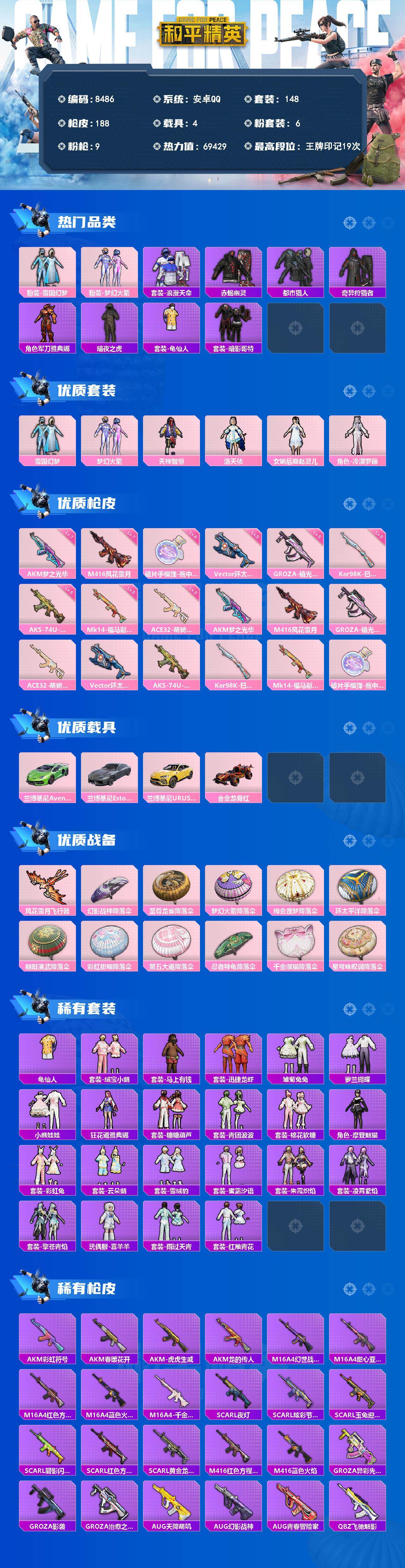 【8486】安卓 手Q-6粉装-9特效枪-4载具-2粉色飞行器-69429热力值-19王牌印记-148套装-188枪皮