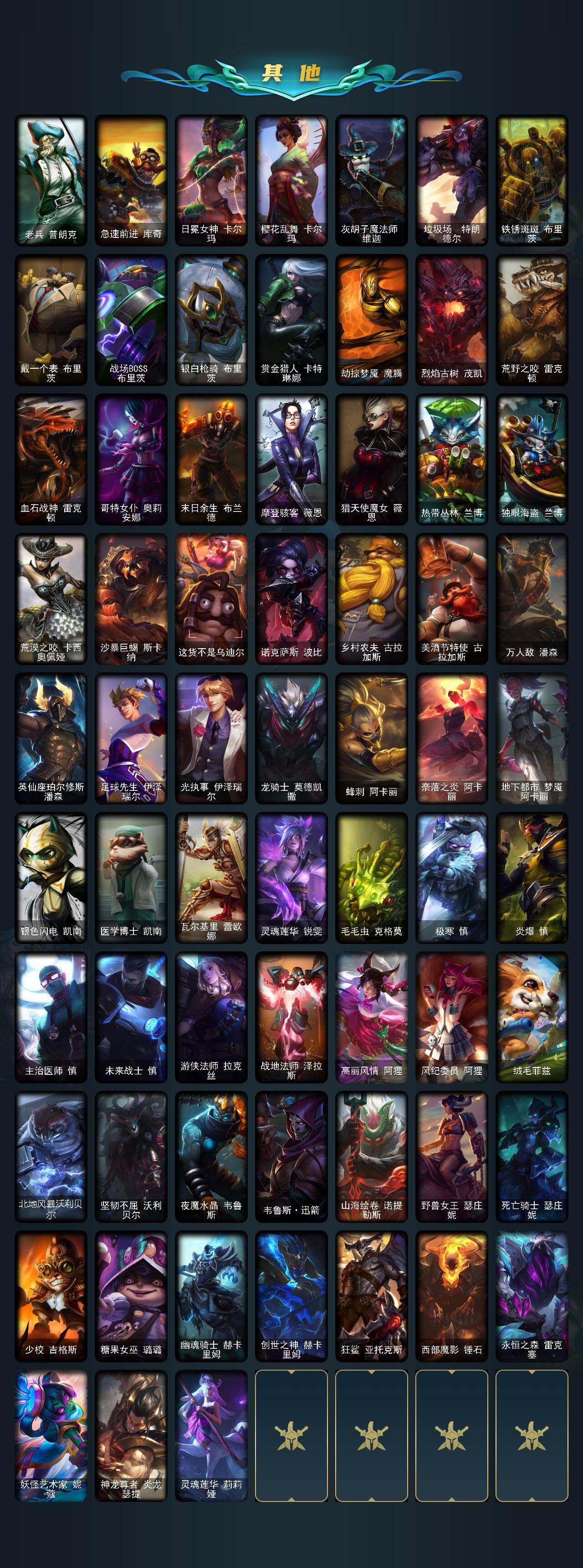 【冰雪限定】:冰雪风暴希维尔,圣诞开心鬼提莫,圣诞糖果棒厄运小姐,阿木木“主人不要我了”,平安夜女神娑娜,邪恶圣诞老人维迦,喜庆之树茂凯,雪默丁格,圣诞驯鹿克格莫,冰雪女神辛德拉