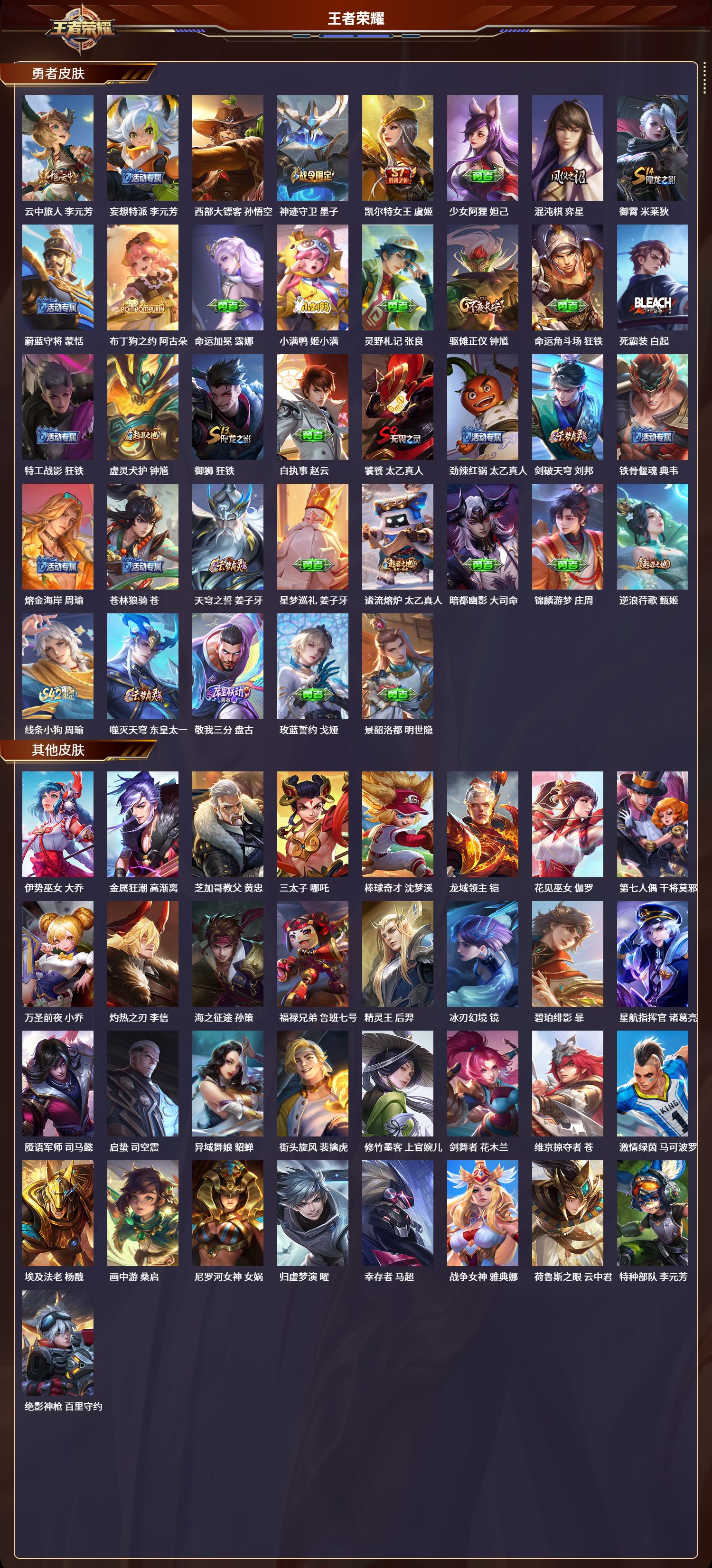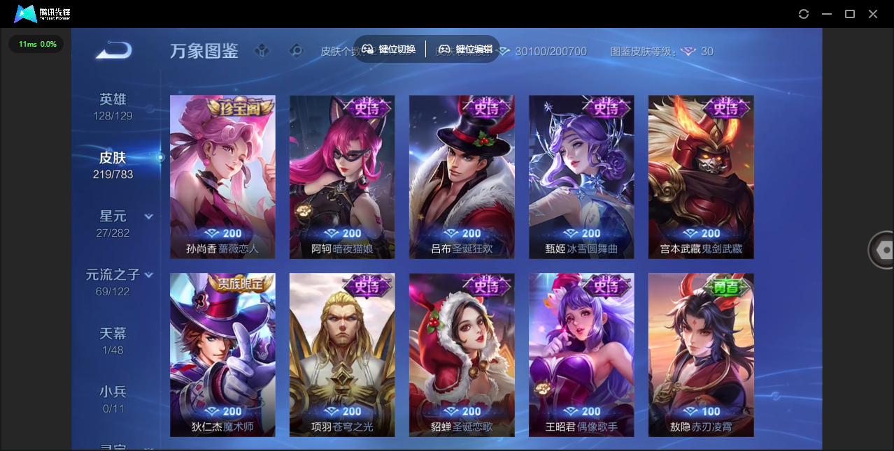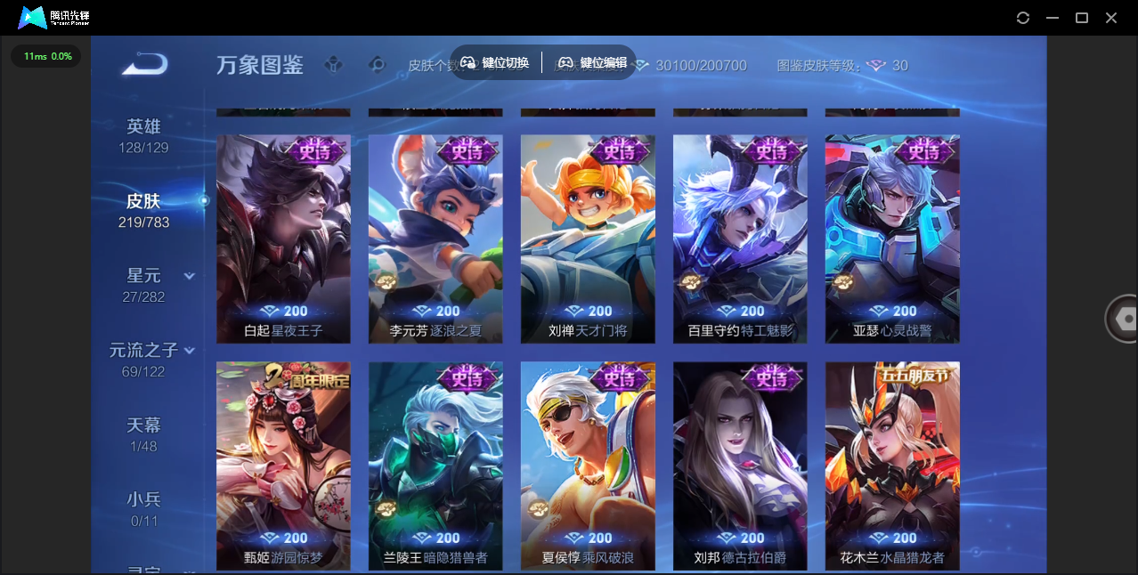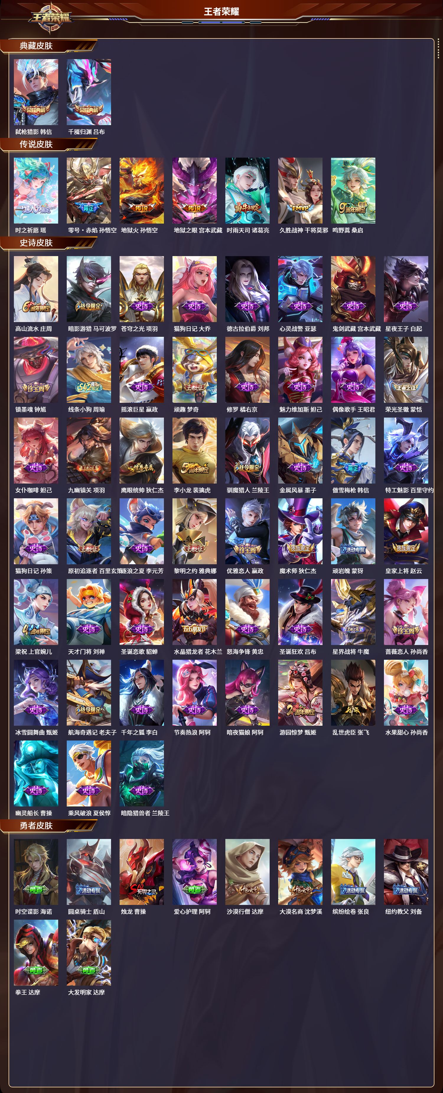 荣耀王者/219皮肤/128英雄/2典藏/0珍品无双/0无双/0珍品传说/7传说/51史诗/9稀有英雄