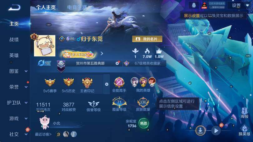 贵族等级8/荣耀典藏数量1/传说皮肤数量22/史诗皮肤数量89/皮肤数量336/英雄数量127/段位最强王者/鬼谷子全皮/狂铁全皮/空空儿全皮/星空梦想 鲁班七号/神树通天 后羿/怒海麟威 吕布/无双飞将 马超/启示之音 露娜/寅虎·赤拳 裴擒虎/李逍遥 曜/音你心动 周瑜/音你心动 小乔/绛天战甲 铠/炽阳神光 镜/启明星使 虞姬/久胜战神 干将莫邪/黄金狮子座 达摩/白虎志 百里玄策/胖达