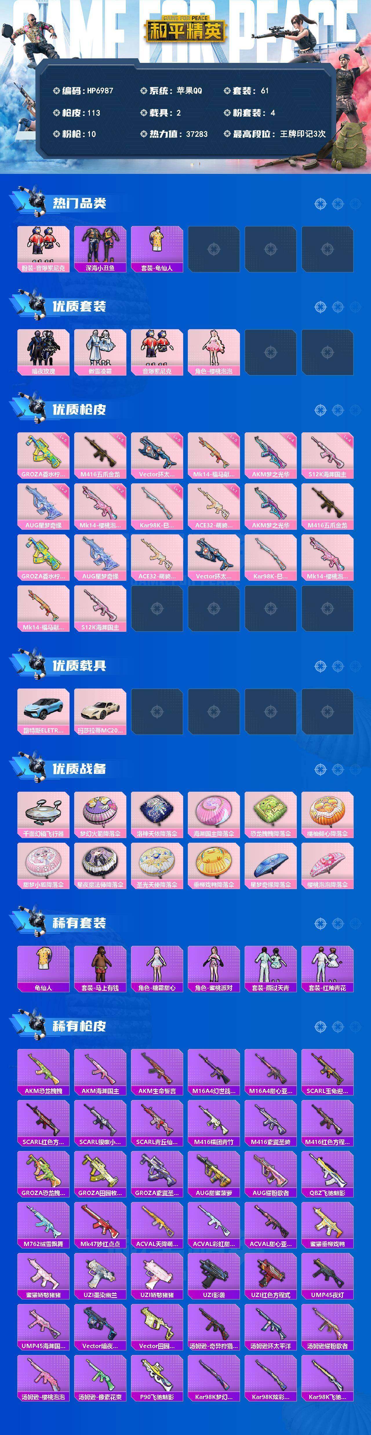 (4粉套10粉枪2载具)音爆索尼克/暗夜玫瑰/傲雪凌霜/音爆索尼克/樱桃泡泡/AKM梦之光华四级/M416五爪金龙五级/GROZA香水柠檬五级/AUG星梦奇缘三级/ACE32萌骑漫游一级/Vector环太平洋五级/Kar98K巳巳如意一级/Mk14樱桃泡泡二级/Mk14福马献瑞五级/S12K海渊国主四级/路特斯冰川蓝/玛莎拉蒂星石白/没战神框/HP6987-1粉色飞行器-37283热力值-3王牌