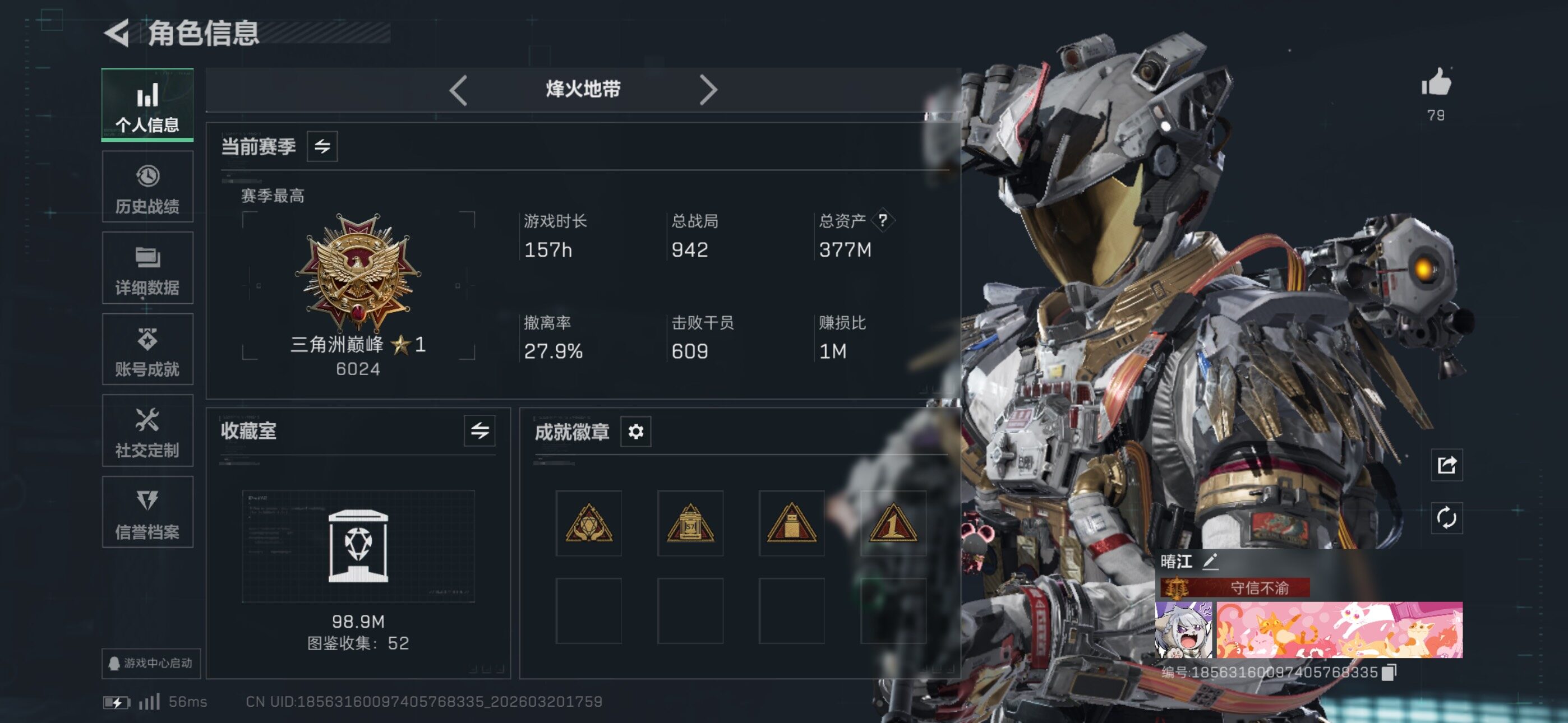 总资产376M/哈夫币4400万/传说近战数1/传说枪皮数49/战场等级50/行动等级60/安全箱等时效性道具以游戏内数据为准,详情请看图/骇爪-水墨云图/威龙-凌霄戍卫/蜂医-送葬人·无题密令/深蓝-不破誓约/红狼-电锯惊魂/露娜-金牌射手/乌鲁鲁-荒原猎手/近战-暗星/近战-北极星/近战-信条/近战-怜悯/近战-龙牙/近战-黑鹰/AUG突击步枪-气象感应/腾龙突击步枪-气象感应/M7战斗步