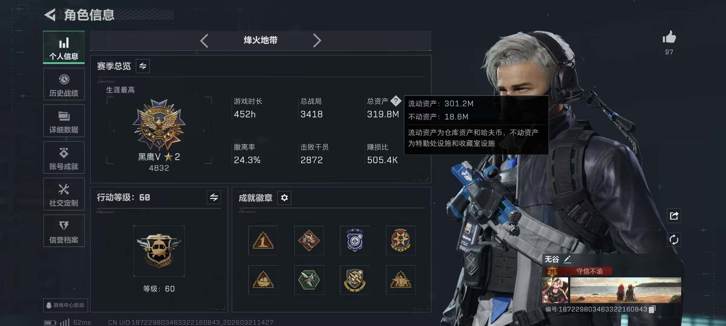 【SJ1511】319m总资产-116981k哈夫币-60烽火等级-钻石-50战场等级-上等兵
