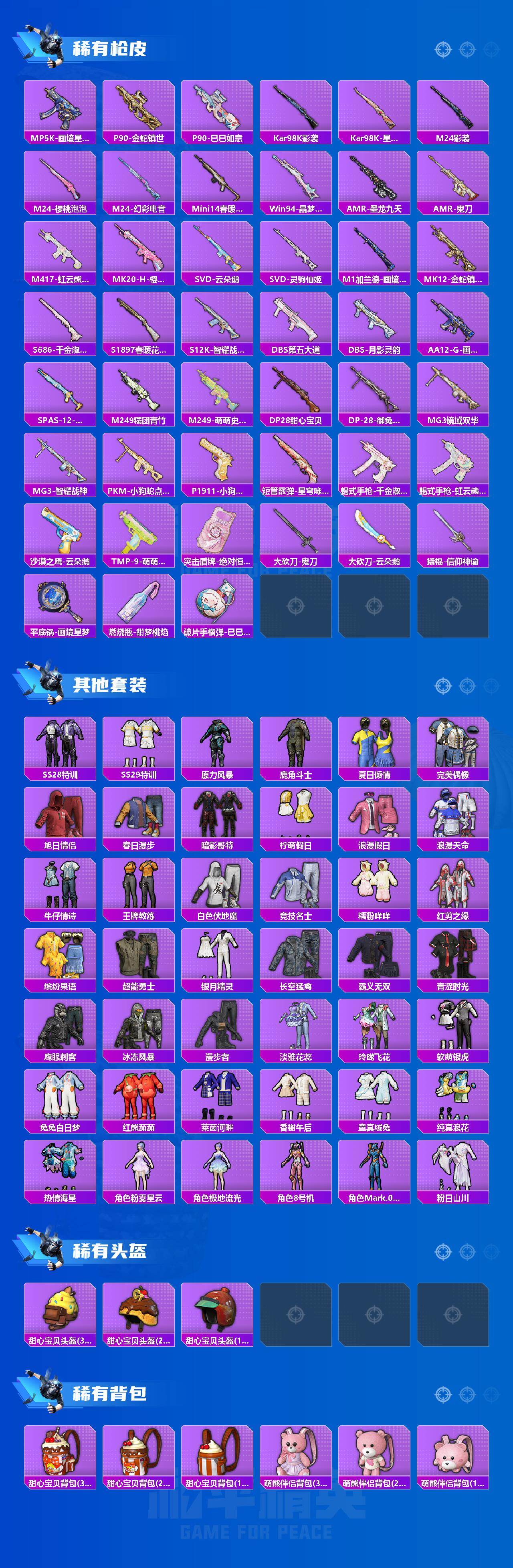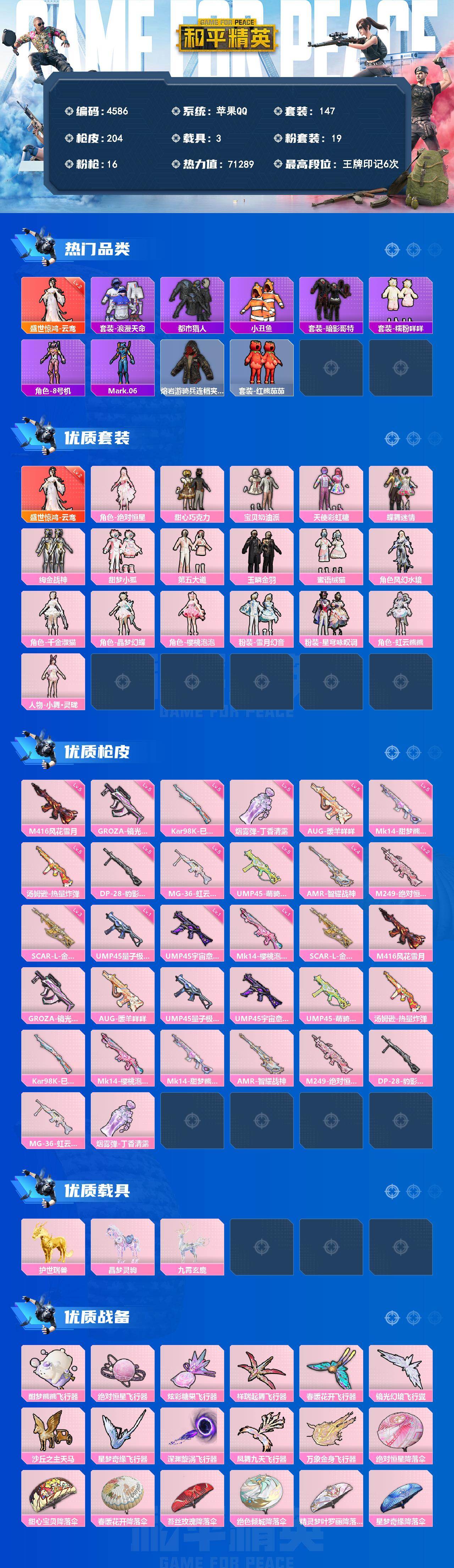 147套装/枪械16/装备299/载具3/战备154/王牌印记6/热力值71289/三级SCAR-L-金蛇镇世/五级M416-风花雪月/五级GROZA-镜光银凌/五级AUG-暖羊咩咩/UMP45-量子极限/UMP45-宇宙意志/五级UMP45-萌骑冒险/五级汤姆逊-热量炸弹/五级Kar98K-巳巳如意/一级Mk14-樱桃泡泡/五级Mk14-甜梦熊击/四级AMR-智耀战神/二级M249-绝对恒星/五级DP-28-豹影疾电/五级MG-36-虹云熊熊/五级烟雾弹-丁香清露/二级盛世惊鸿-云鸾/盛世惊鸿