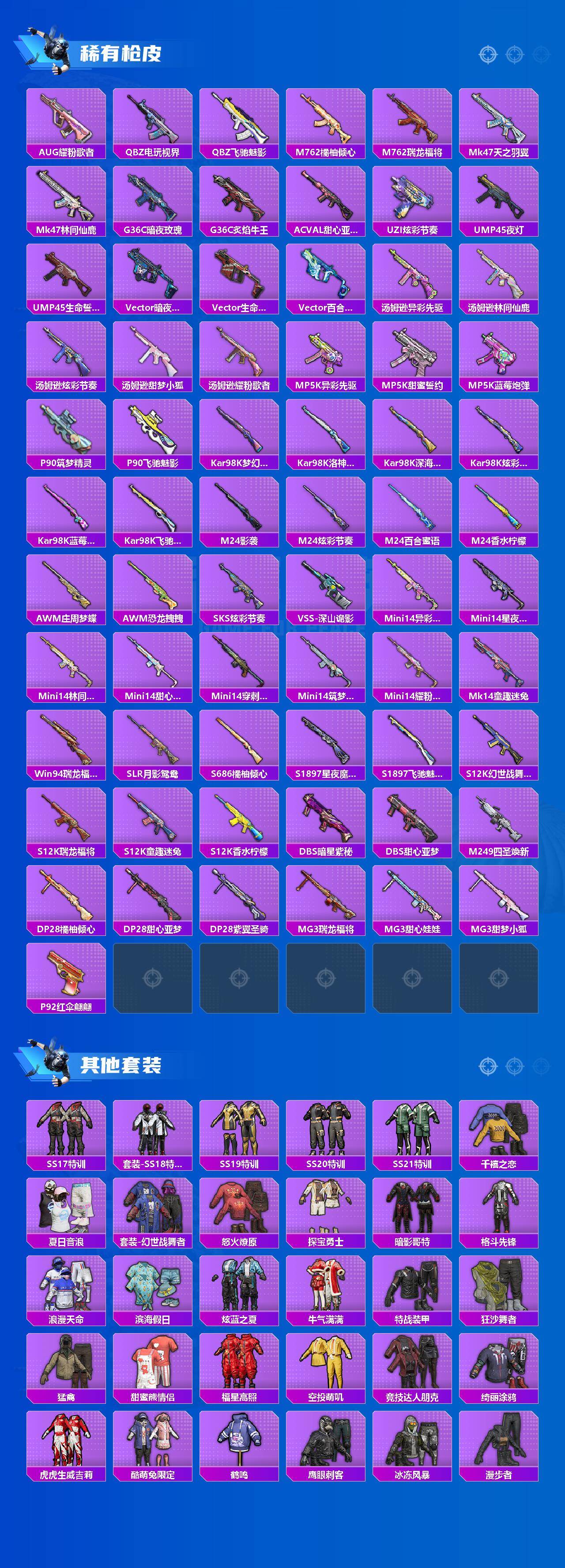 96套装/枪械8/装备168/载具1/战备108/王牌印记3/热力值49588/四级AKM-梦之光华/AKM-百合蜜语/四级SCAR-L-青春物语/四级M416-心之恋语/四级M762-甜心娃娃/四级UMP45-相思残雪/UMP45-恐龙拽拽/四级M249-蓝莓炮弹/粉装-梦幻火箭/粉装-童趣迷兔/粉装-缤纷油彩/套装-浪漫天命/深海小丑鱼/奇异狩猎者/胖达团团/胖达圆圆/套装-暗影哥特/套装-萌熊伴侣/独舞天鹅/宝贝奶油派/天使彩虹糖/蝶舞迷情/梦幻火箭/缤纷油彩/天禅智恒/新星烈龙/草莓生巧