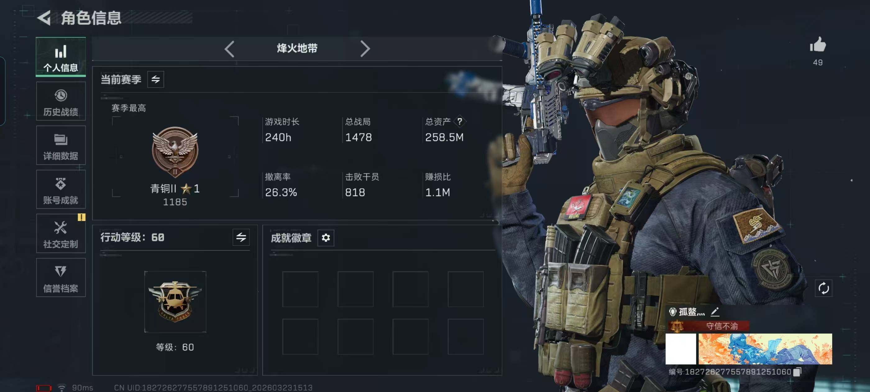 【SJ1517】256m总资产-610k哈夫币-60烽火等级-青铜-4战场等级-无军衔