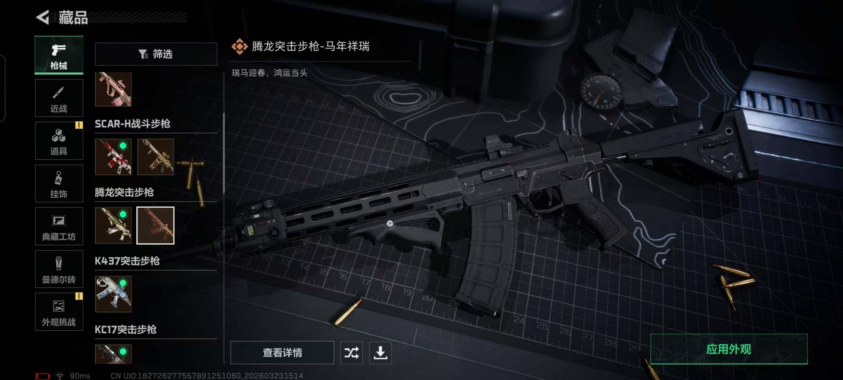 【传说外观】:M4A1突击步枪-蚀金玫瑰,AKM突击步枪-锦绣,AUG突击步枪-悠然茶歇,SCAR-H战斗步枪-启航,SCAR-H战斗步枪-荼蘼,腾龙突击步枪-马年祥瑞,腾龙突击步枪-万金泪冠,K437突击
