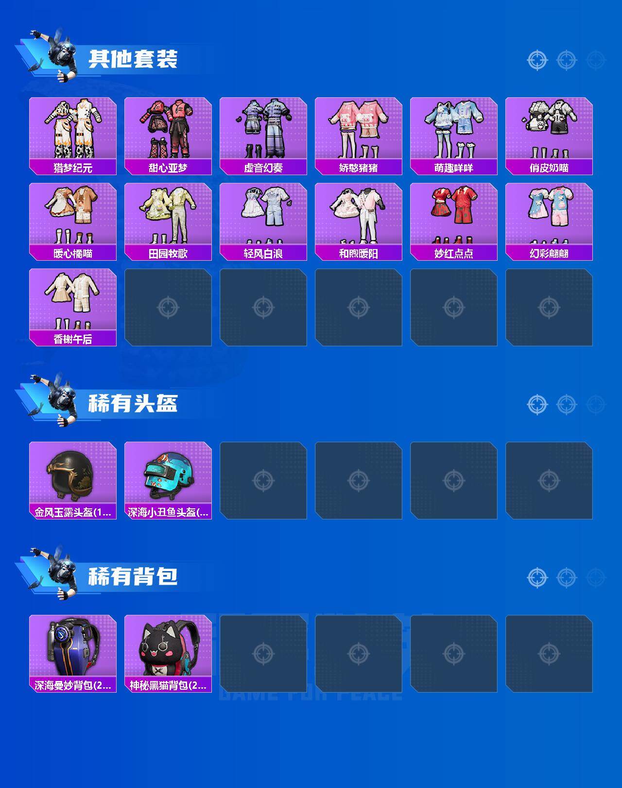粉装6/粉枪6/载具1/珍稀飞行器72259/套装160/枪皮210/热力值65810/历史最高段位:王牌印记10次/Lv:66/六级SCAR-L-青春物语/七级M416-心之恋语/五级Mk14-福马献瑞/六级SLR-暗夜玫瑰/五级M249-彩虹甜喵/五级DP-28-豹影疾电/套装-浪漫天命/深海小丑鱼/小丑鱼/星河浪客/动感兔斯基人偶服/套装-暗影哥特/套装-浪漫波比/星夜魔法师/彩虹甜喵/第五大道/粉装-幻彩电音/角色-罗征/角色-虎痴许褚/兰博基尼Estoque(银翼灰)/SCAR-L-青