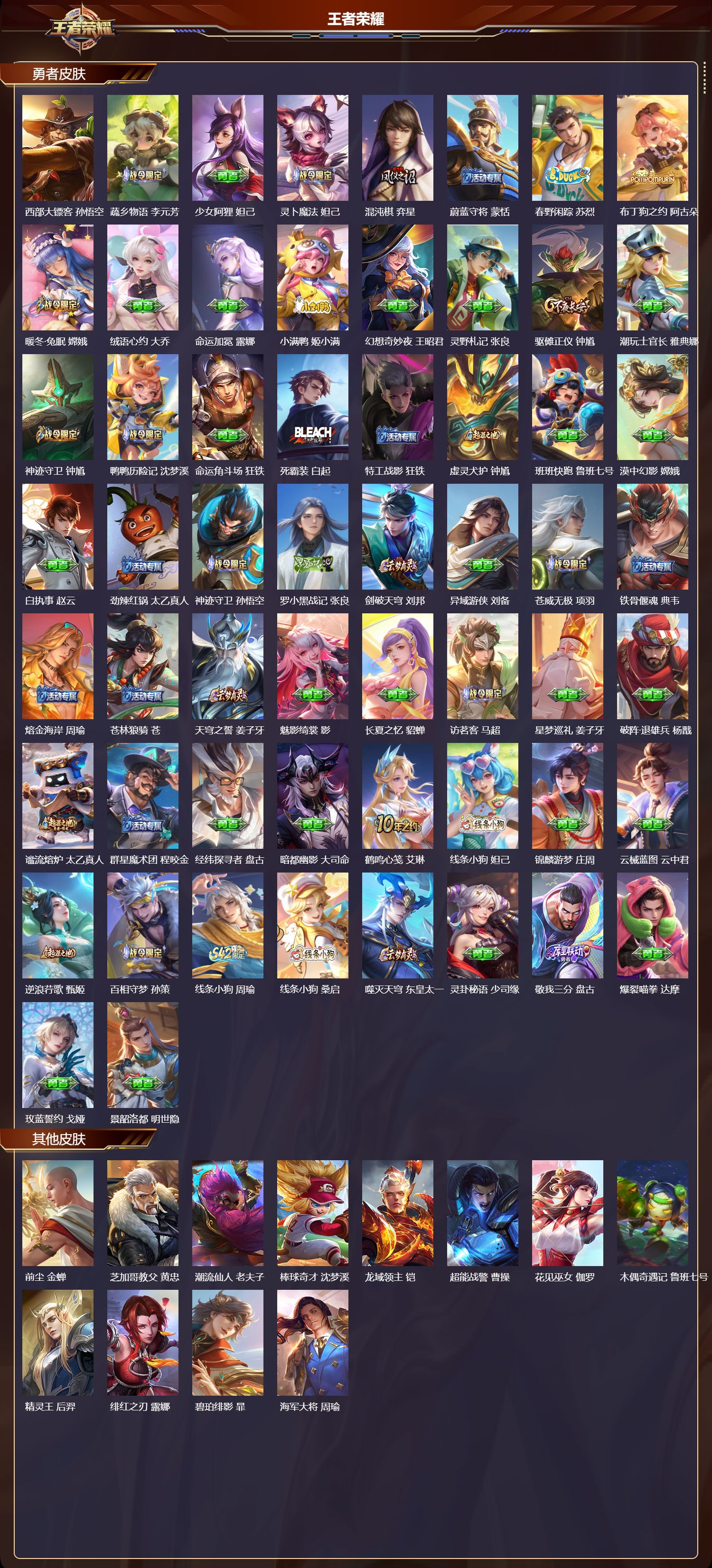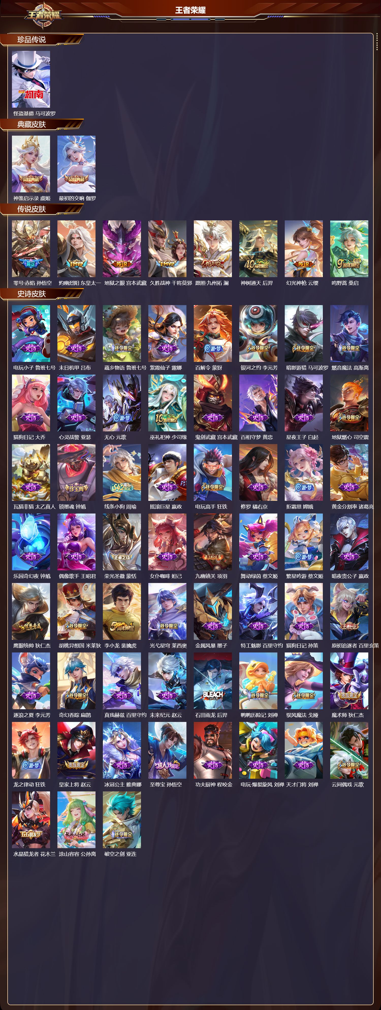 安卓QQ/无双王者/304皮肤/128英雄/2典藏/0珍品无双/0无双/1珍品传说/8传说/87史诗/9稀有英雄【1 珍品传说】怪盗基德 马可波罗,【2 典藏皮肤】神鉴启示录 虞姬,最初的交响 伽罗,【8 传说皮肤】零号·赤焰 孙悟空,灼幽烈阳 东皇太一,地狱之眼 宫本武藏,久胜战神 干将莫邪,愿照·九州拓 澜,神树通天 后羿,幻光神枪 云缨,鸣野蒿 桑启,【87 史诗皮肤】电玩小子 鲁班七号,末