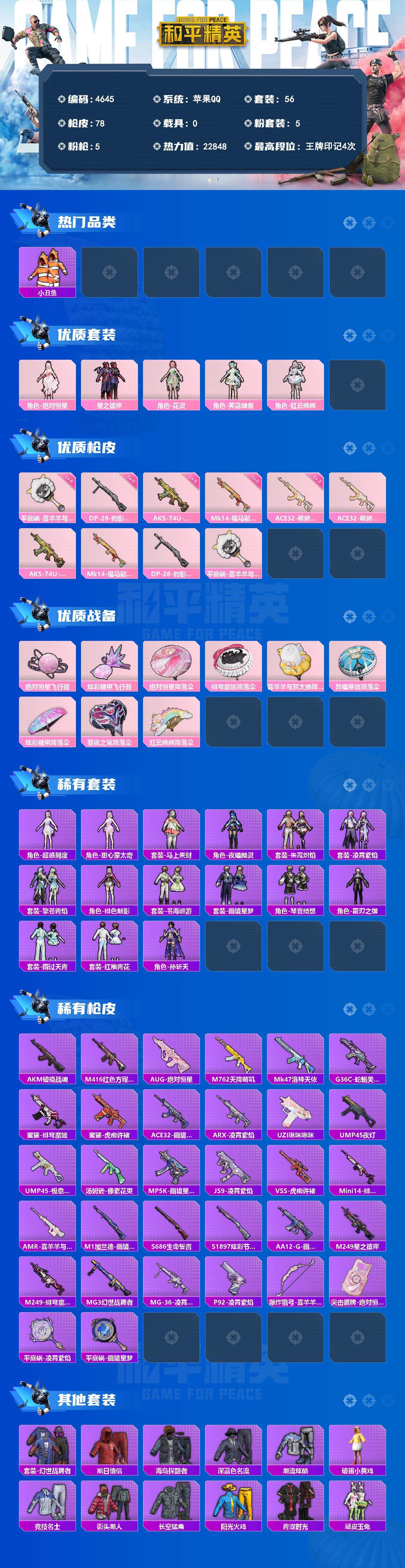 56套装/枪械5/装备105/战备65/王牌印记4/热力值22848/三级ACE32-萌骑漫游/五级AKS-74U-森灵之息/五级Mk14-福马献瑞/五级DP-28-豹影疾电/六级平底锅-喜羊羊与灰太狼/小丑鱼/角色-绝对恒星/星之彼岸/角色-花灵/角色-霁蓝缠春/角色-虹云熊熊/ACE32-萌骑漫游/AKS-74U-森灵之息/Mk14-福马献瑞/DP-28-豹影疾电/平底锅-喜羊羊与灰太狼/绝对恒星飞行器/炫彩糖果飞行器/绝对恒星降落伞/绯穹魔姬降落伞/喜羊羊与灰太狼降落伞/异瞳寒姬降落伞/炫