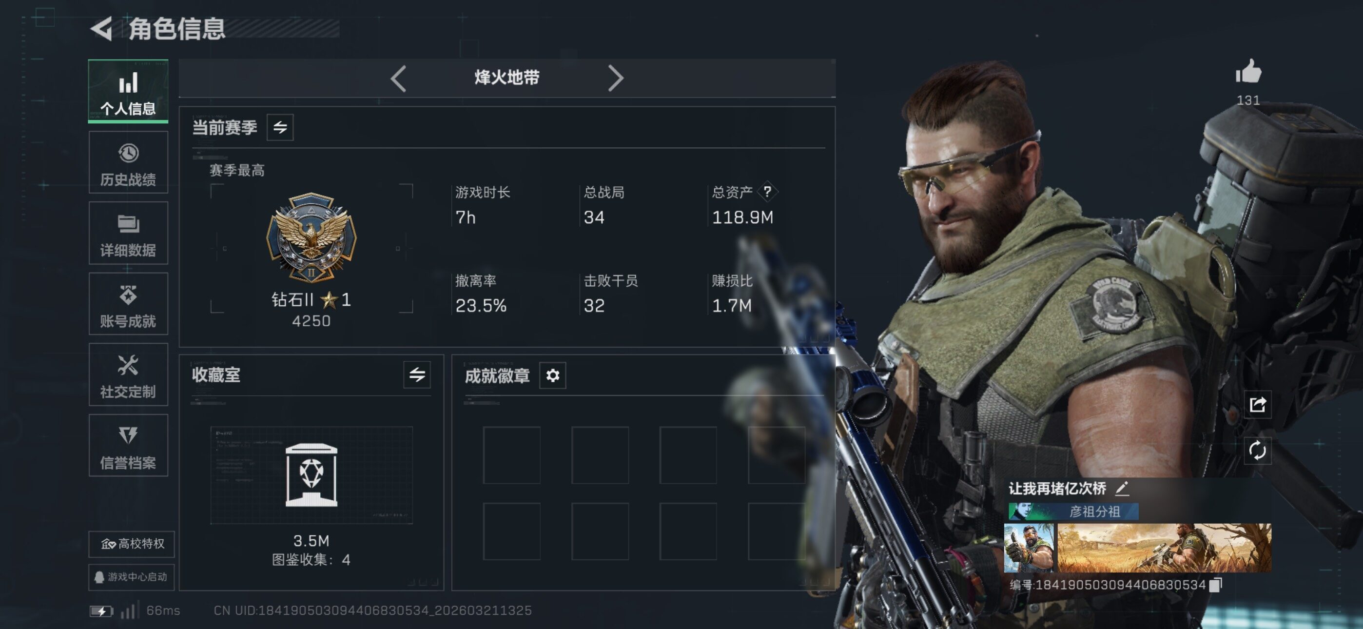 总资产118M/哈夫币783万/传说近战数1/传说枪皮数27/战场等级40/行动等级60/安全箱等时效性道具以游戏内数据为准,详情请看图/红狼-蚀金玫瑰/露娜-黑·天际线/威龙-壮志凌云/威龙-飞虎/蜂医-送葬人·无题密令/无名-夜鹰/深蓝-不破誓约/红狼-电锯惊魂/露娜-金牌射手/近战-影锋/近战-黑鹰/M4A1突击步枪-蚀金玫瑰/M4A1突击步枪-阿米娅/M16A4突击步枪-狩猎时刻/SG