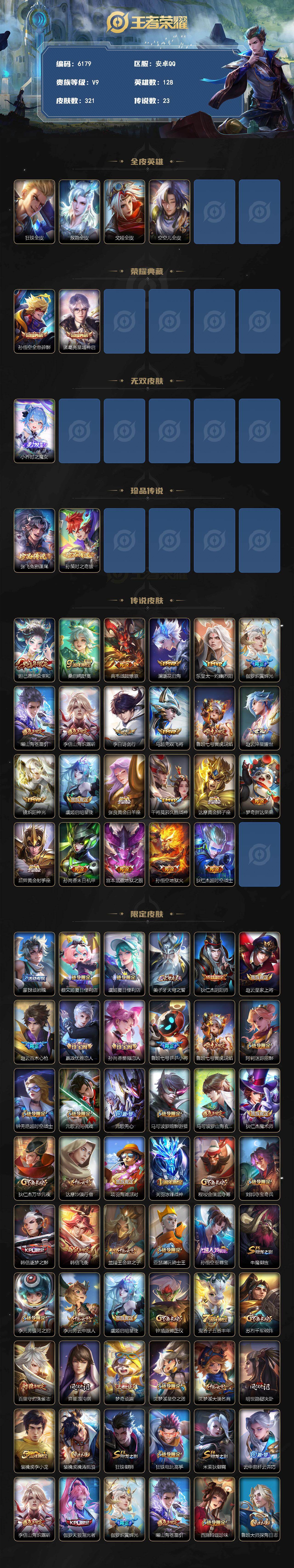 贵族等级9/荣耀典藏数量2/传说皮肤数量23/史诗皮肤数量87/皮肤数量321/英雄数量128/段位最强王者/狂铁全皮/敖隐全皮/戈娅全皮/空空儿全皮/全息碎影 孙悟空/星域神启 诸葛亮/时之魔女 小乔/兔狲·蓬尾 张飞/时之奇旅 孙策/愿照·众生和 妲己/鸣野蒿 桑启/战鼓燎原 典韦/逐花归海 澜/灼幽烈阳 东皇太一/炽翼辉光 伽罗/山海·苍雷引 曜/山海·炽霜斩 李信/诗剑行 李白/无双飞
