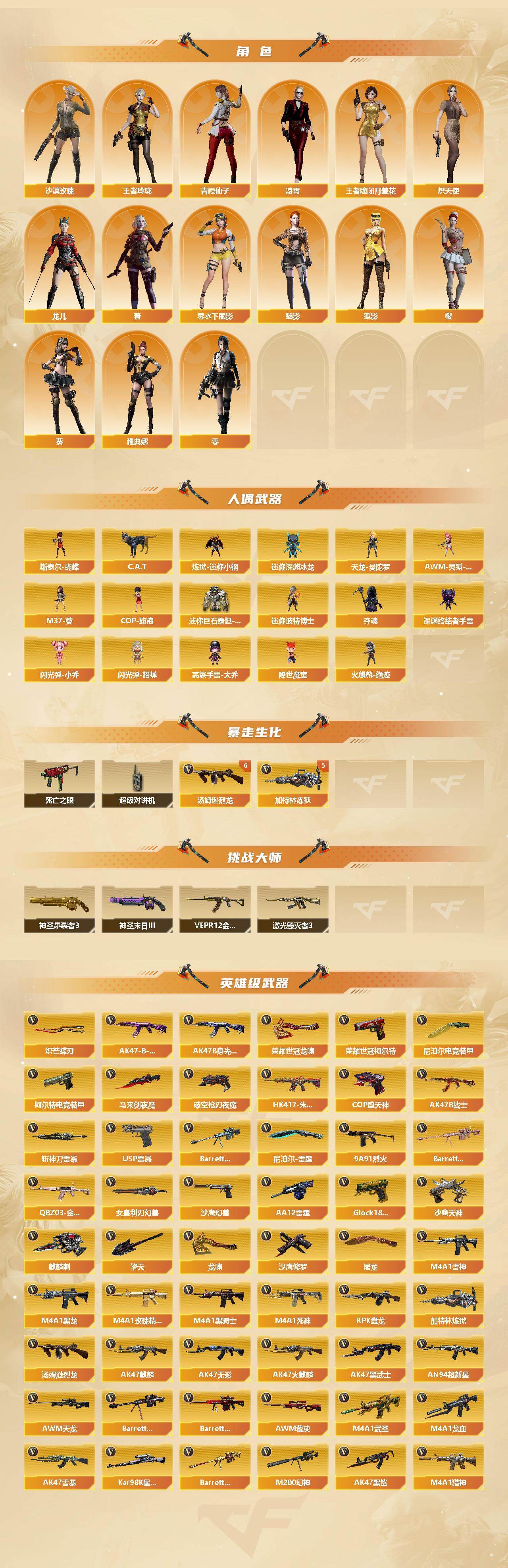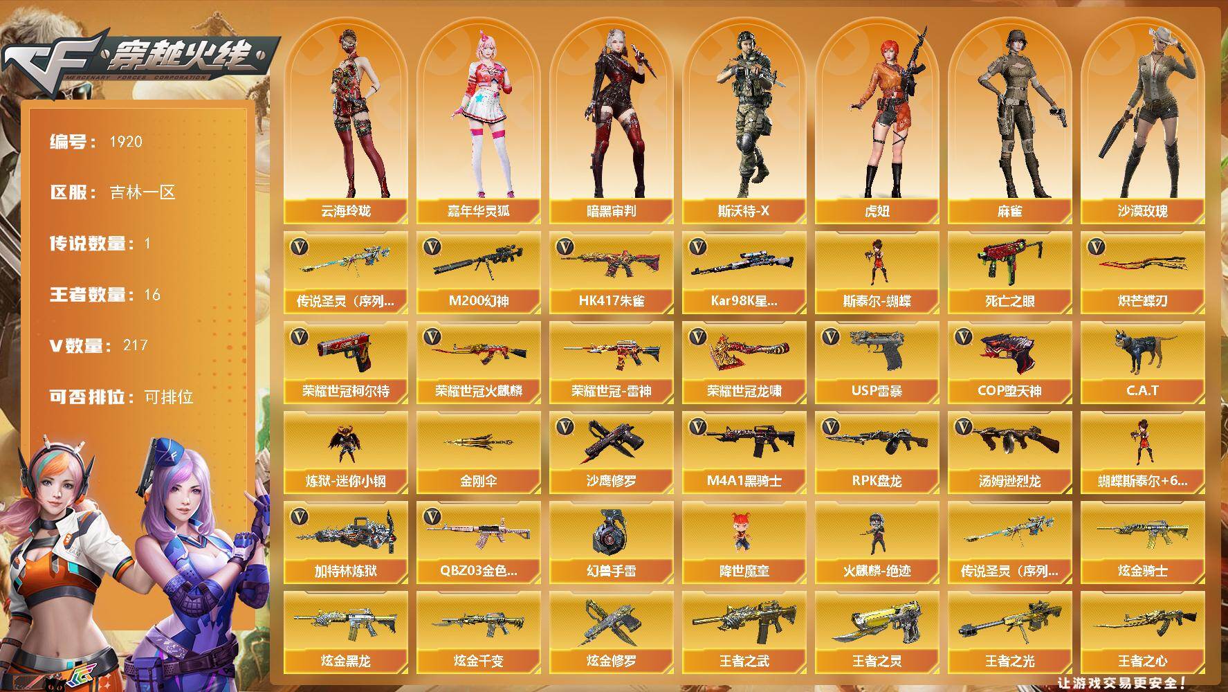 【热门武器】:传说圣灵(序列号版),QBZ03-金色蔷薇*3,HK417-朱雀,M200-幻神,死亡之眼*2,荣耀世冠-火麒麟,荣耀世冠-雷神,荣耀世冠-柯尔特*2,Kar98K-星神,C.A.T,炼狱-迷你小钢,M4A1-黑骑士*2,汤姆逊-烈龙*11,RPK-盘龙*3,加特林-炼狱