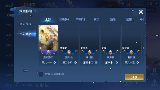 贵族等级7/荣耀典藏数量1/传说皮肤数量14/史诗皮肤数量72/皮肤数量251/英雄数量127/段位最强王者/孙权全皮/敖隐全皮/空空儿全皮/鸣剑·曳影 李白/伽罗沧流箭/器灵·落星盏 嫦娥/云缨神骥越千峰/关羽神骥镇沧海/狄仁杰神骥赴朔漠/马超神骥逐星野/鸣野蒿 桑启/曦玄引 吕布/无双飞将 马超/寅虎·赤拳 裴擒虎/祈雪灵祝 公孙离/炽阳神光 镜/黄金白羊座 张良/久胜战神 干将莫邪/末日