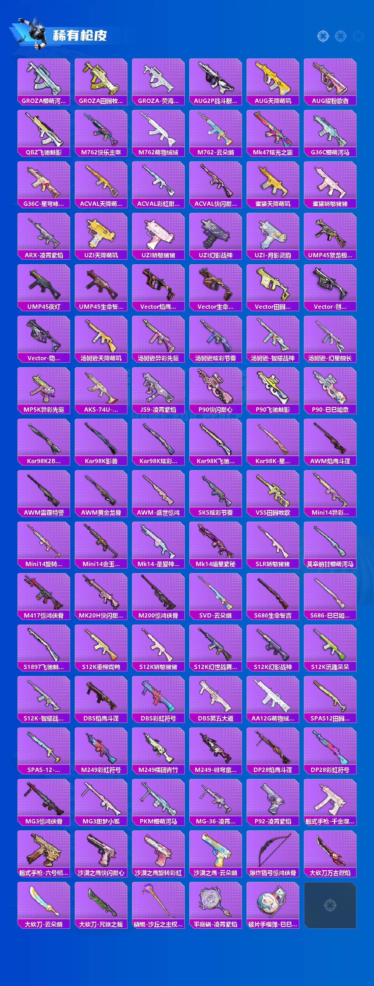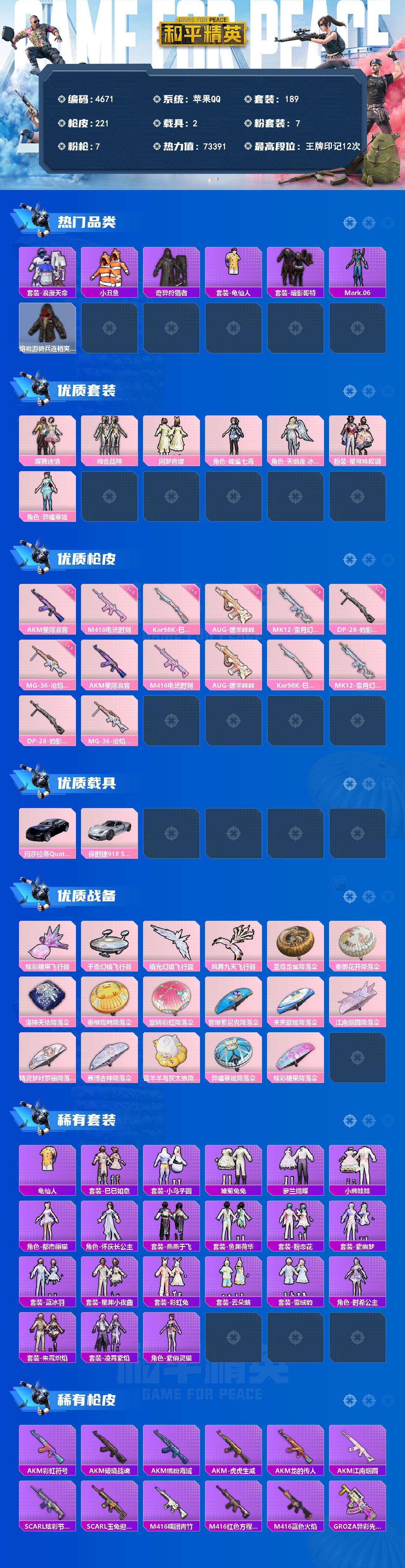 粉装7/粉枪7/载具2/珍稀飞行器,72272,,/套装189/枪皮221/热力值73391/历史最高段位:王牌印记12次/Lv:63/七级AKM-星际浪客/五级M416-电玩时刻/五级AUG-暖羊咩咩/五级Kar98K-巳巳如意/五级MK12-雪月幻音/五级DP-28-豹影疾电/五级MG-36-沧焰双生/套装-浪漫天命/小丑鱼/奇异狩猎者/套装-龟仙人/套