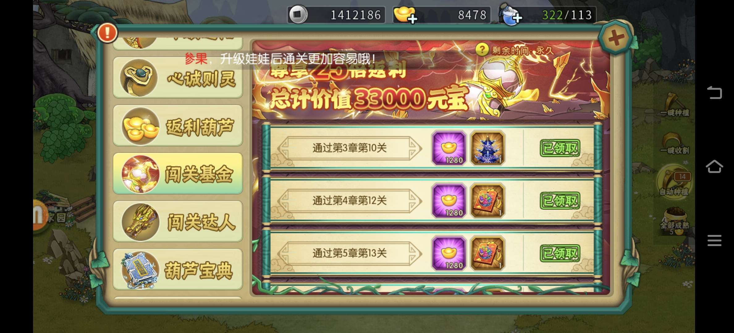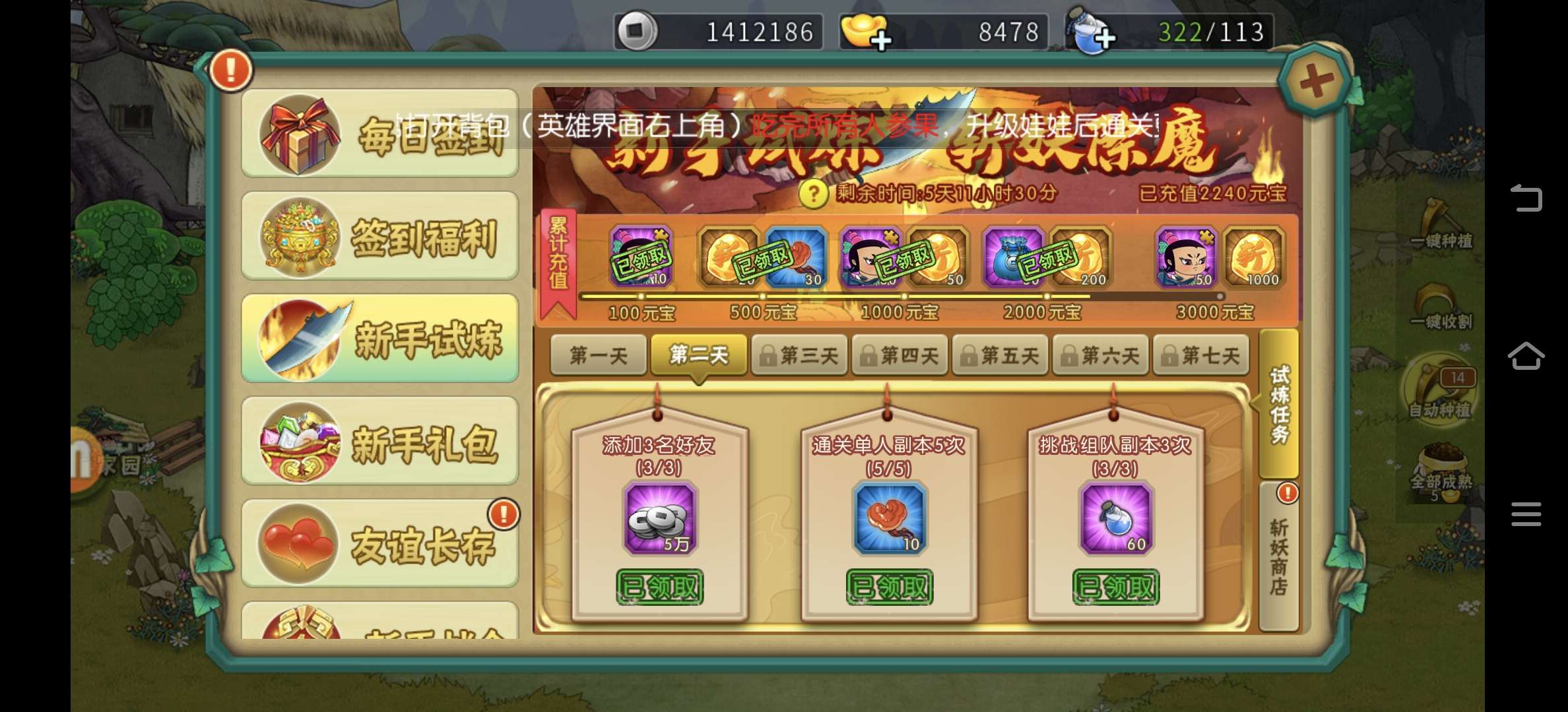 新区开服两天的葫芦娃账号,3月26号注册,游戏币4770,战令、基金这些基本都买了