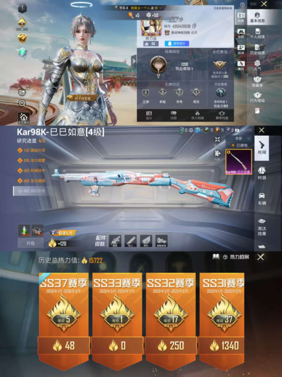 二次-双字ID -1特效枪-15674热力值-43套装-46枪皮【特效枪等级】:Kar98K-巳巳如意(四级- Kar98K-巳巳如意)【优质武器皮肤】: Kar98K-巳巳如意【稀有武器皮肤】: DBS-乌木金纹 蜜獾-精灵梦叶罗丽 SCAR-L-海盐豹豹 Kar98K-巳巳如意 M416-蓝色火焰 M416-夜灯 AKM-破晓战魂 AKM-灼热熔岩 SCAR-L-红色方程式