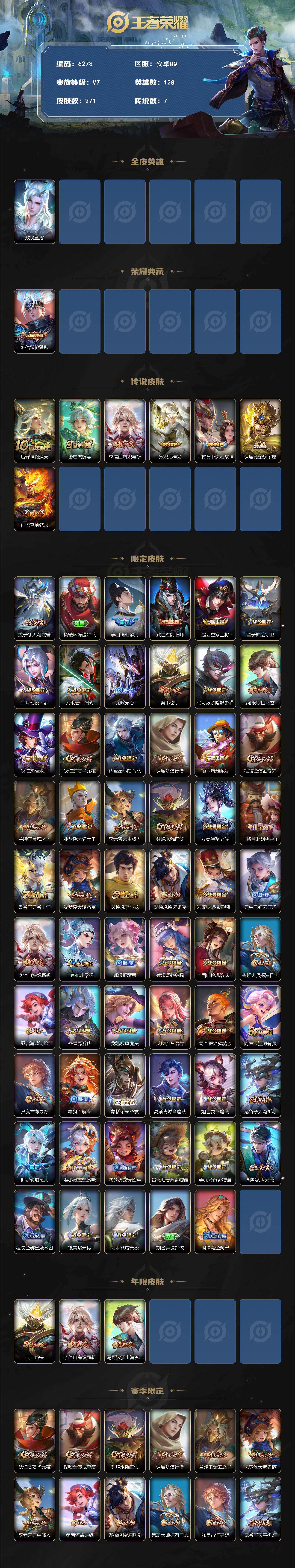 贵族等级7/荣耀典藏数量1/传说皮肤数量7/史诗皮肤数量69/皮肤数量271/英雄数量128/段位最强王者/敖隐全皮/弑枪猎影 韩信/神树通天 后羿/鸣野蒿 桑启/山海·炽霜斩 李信/炽阳神光 镜/久胜战神 干将莫邪/黄金狮子座 达摩/地狱火 孙悟空/天穹之誓 姜子牙/破阵·退雄兵 杨戬/谪仙醉月 李白/阴阳师 狄仁杰/皇家上将 赵云/神迹守卫 墨子/幻夜卜梦 芈月/云间偶戏 元歌/无心 元歌