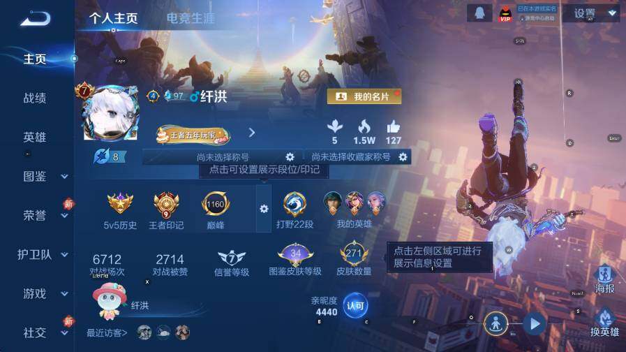 贵族7/皮肤271/典藏1/传说7/史诗69/英雄128/敖隐全皮/