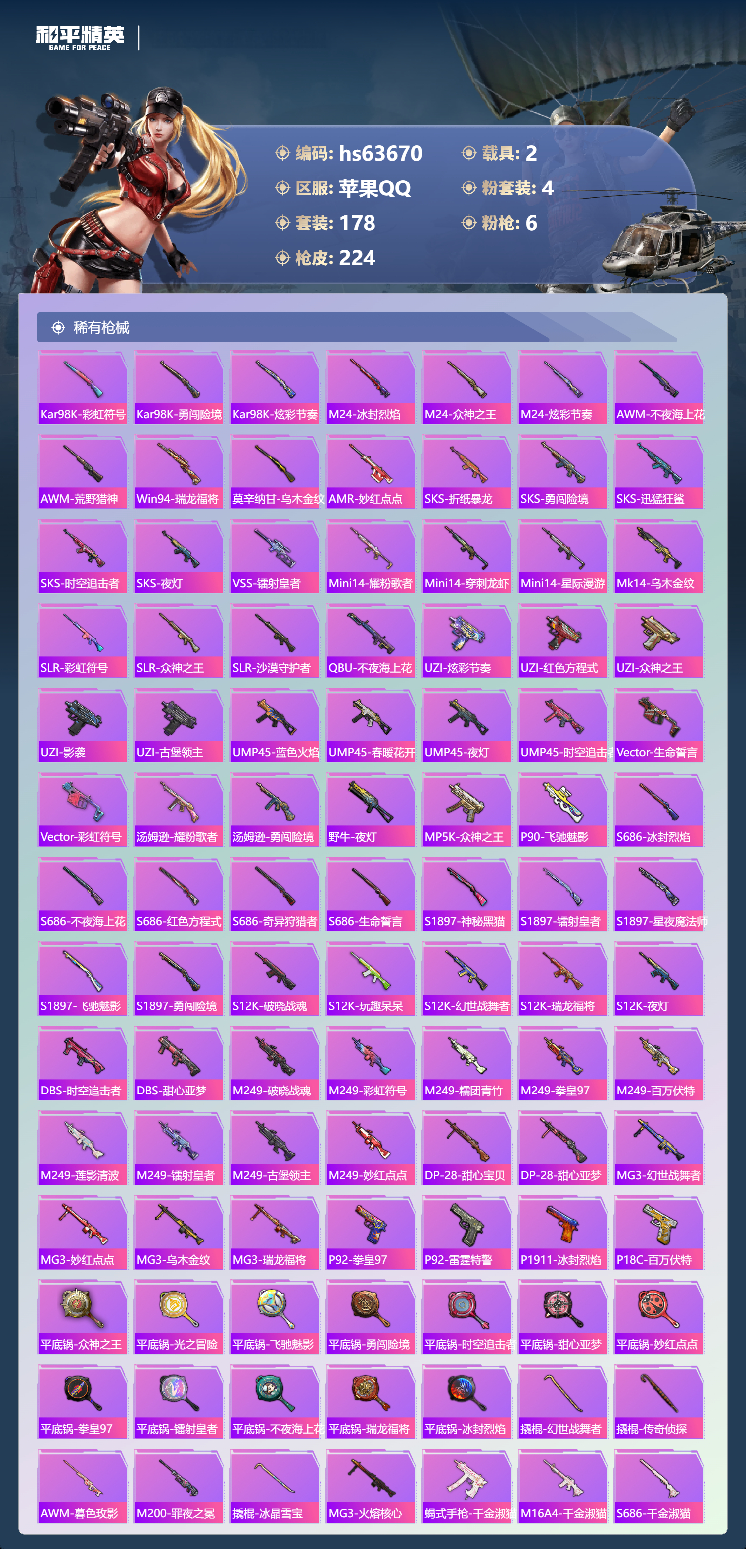 17王牌印记-4粉装-6特效枪-2载具-73374热力值