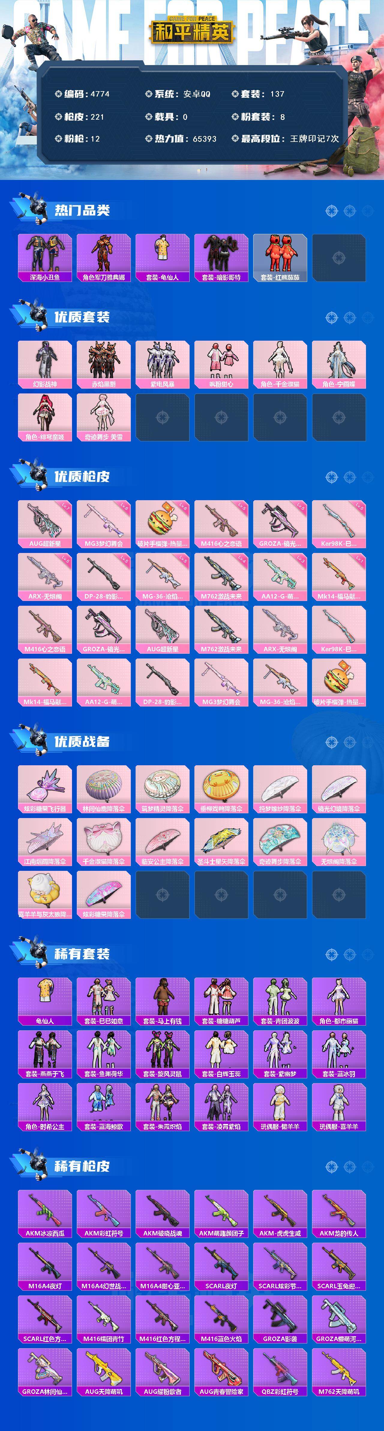 粉装8/粉枪12/珍稀飞行器130245/套装137/枪皮221/热力值65393/历史最高段位:王牌印记7次/Lv:57/五级M416-心之恋语/五级GROZA-镜光银凌/七级AUG-超新星/四级M762-激战未来/五级ARX-无垠阁/五级Kar98K-巳巳如意/一级Mk14-福马献瑞/三级AA12-G-萌骑幻想/五级DP-28-豹影疾电/六级MG3-梦幻舞会/五级MG-36-沧焰双生/六级破片手榴弹-热量炸弹/深海小丑鱼/军刀雅典娜/套装-龟仙人/套装-暗影哥特/套装-红熊茄茄/幻影战神/赤