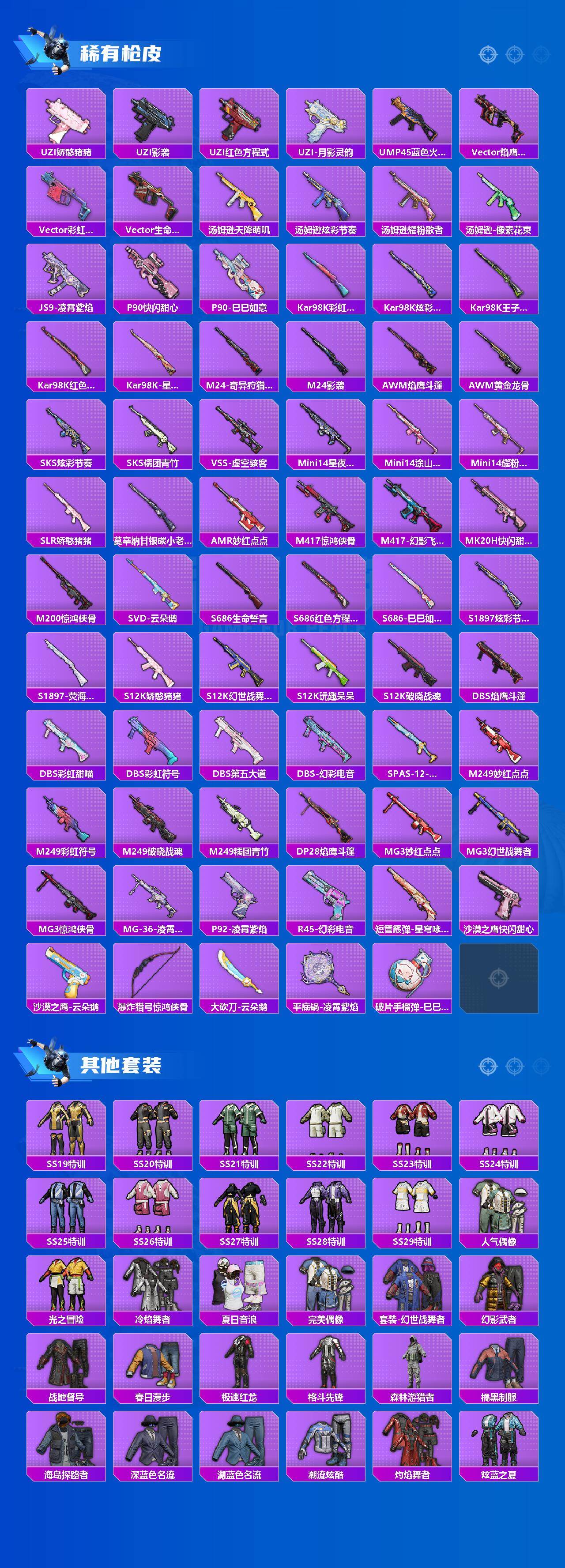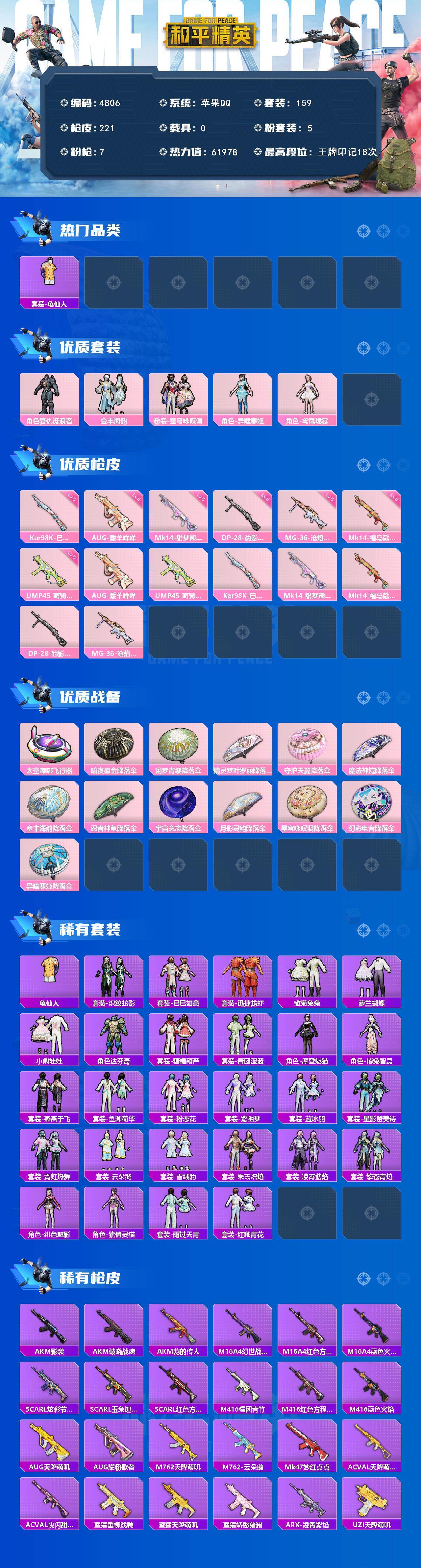 粉装5/粉枪7/珍稀飞行器72273/套装159/枪皮221/热力值61978/历史最高段位:王牌印记18次/Lv:67/五级AUG-暖羊咩咩/五级UMP45-萌骑冒险/五级Kar98K-巳巳如意/五级Mk14-甜梦熊击/五级Mk14-福马献瑞/五级DP-28-豹影疾电/五级MG-36-沧焰双生/套装-龟仙人/复仇流浪者/金丰海韵/粉装-星穹咏叹调/角色-异瞳寒姬/角色-鸢尾珑雾/AUG-暖羊