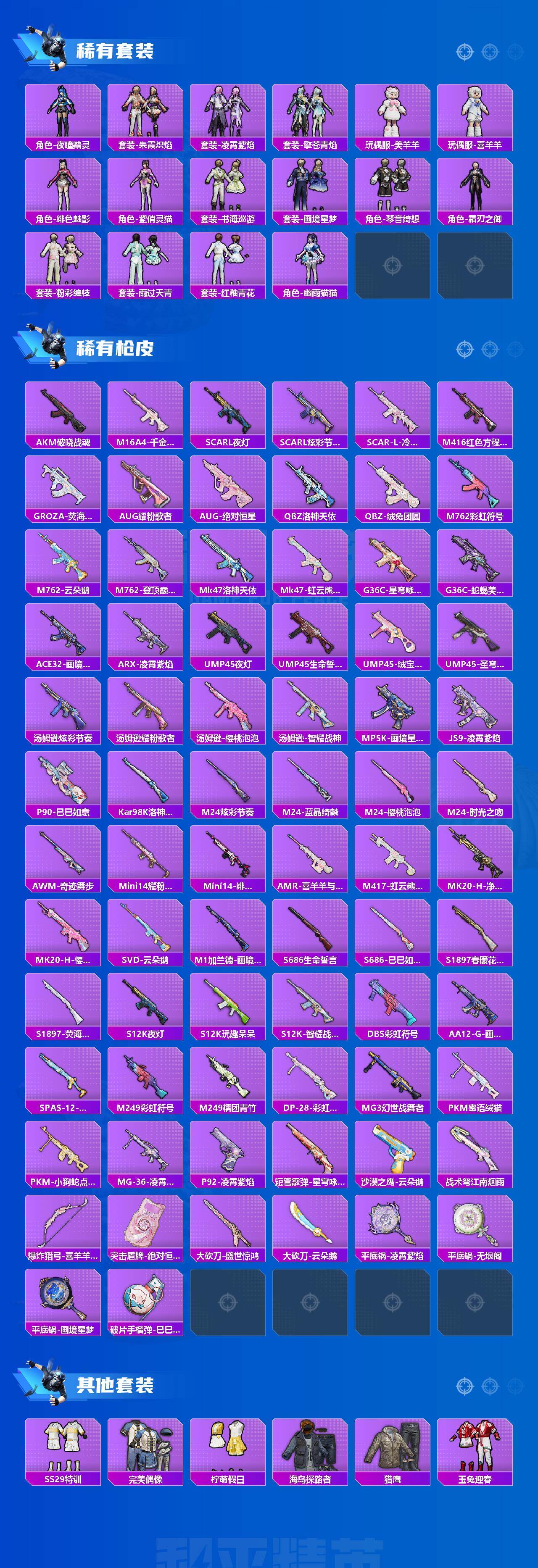 粉装8/粉枪14/载具1/珍稀飞行器123373,130245,103443,114161/套装125/枪皮191/热力值61527/历史最高段位:王牌印记9次/Lv:64/五级AUG-暖羊咩咩/一级ACE32-萌骑漫游/七级Vector-绯穹魔姬/五级汤姆逊-热量炸弹/五级AKS-74U-森灵之息/五级Kar98K-巳巳如意/四级Mk14-樱桃泡泡/五级Mk14-甜梦熊击/五级Mk14-福马献瑞/七级AMR-智耀战神/五级M249-绝对恒星/五级DP-28-豹影疾电/四级MG3-洛神天依/五级
