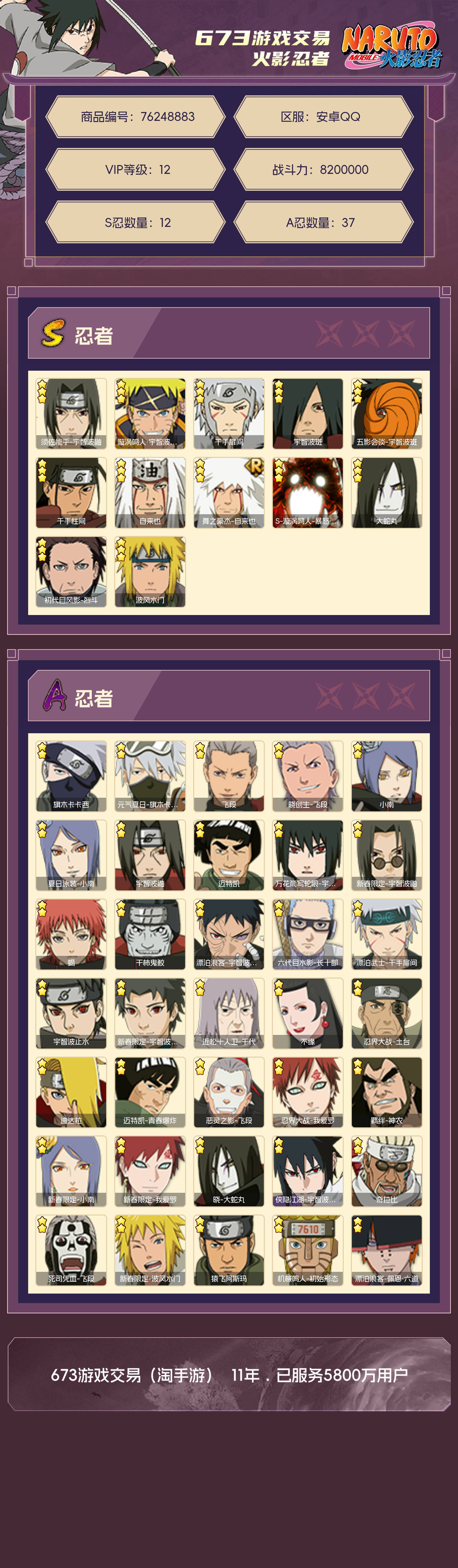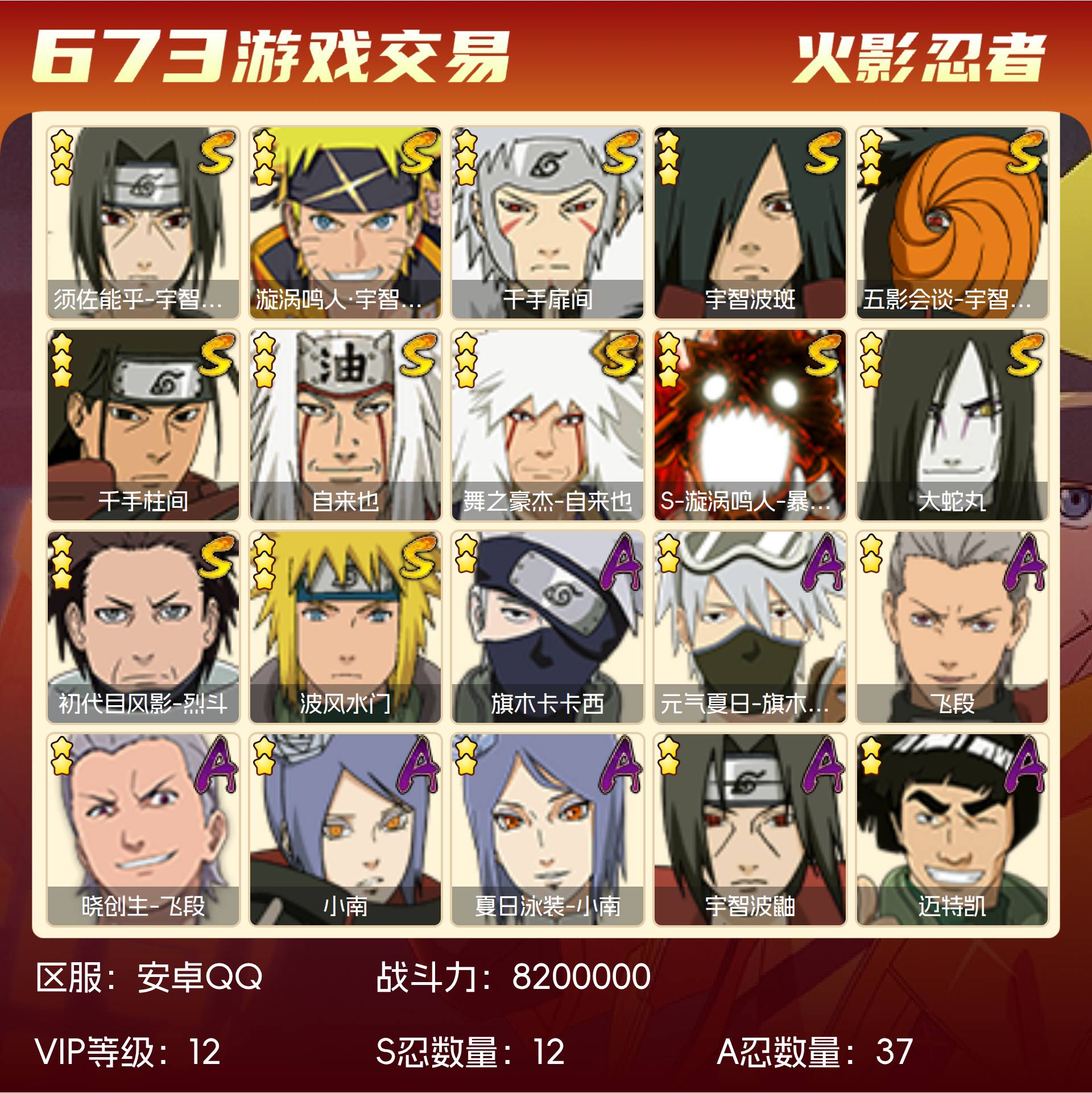 角色等级135 金币5000 战斗力8200000 S忍12 A忍37 5星S忍者5 12 段位超影