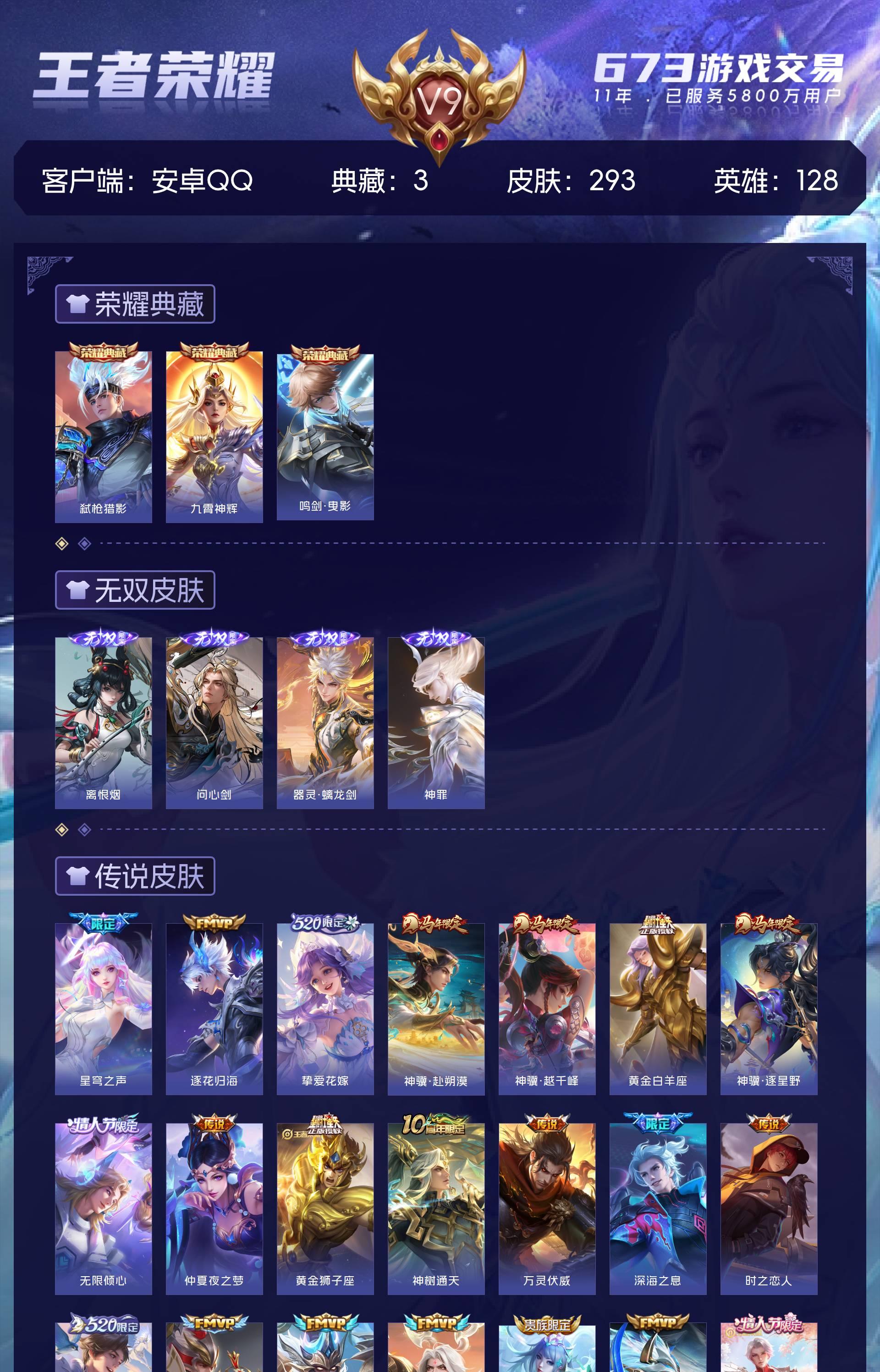 V9 皮肤293 英雄128 荣耀王者 荣耀典藏3 无双皮肤4 传说34
