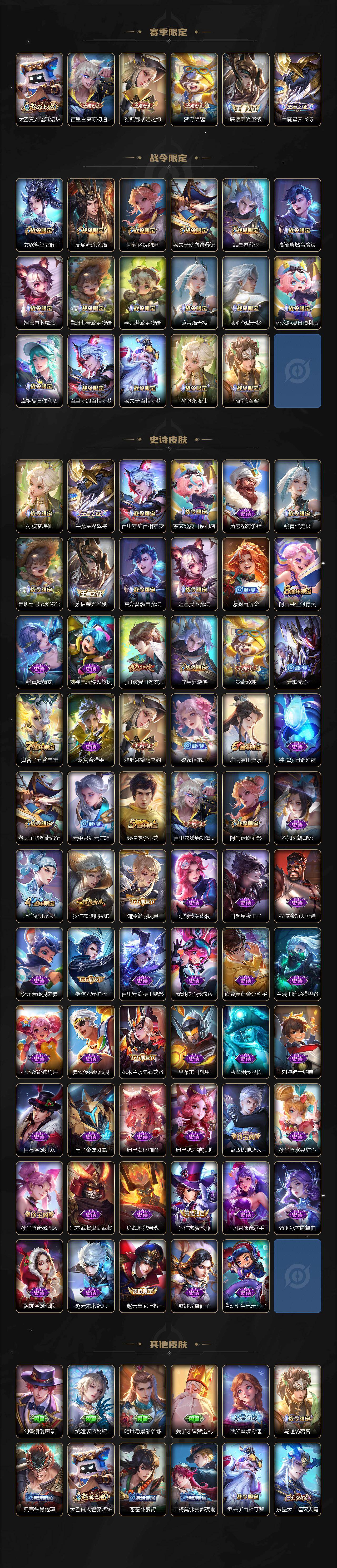 【限定皮肤】:蔡文姬夏日便利店,虞姬夏日便利店,姜子牙天穹之誓,杨戬破阵退雄兵,狄仁杰阴阳师,赵云皇家上将,嬴政优雅恋人,孙尚香蔷薇恋人,庄周高山流水,阿轲迷踪丽影,周瑜赤莲之焰,元歌无心,马可波罗山海玄木吟,狄仁杰魔术师,狄仁杰万华元夜,