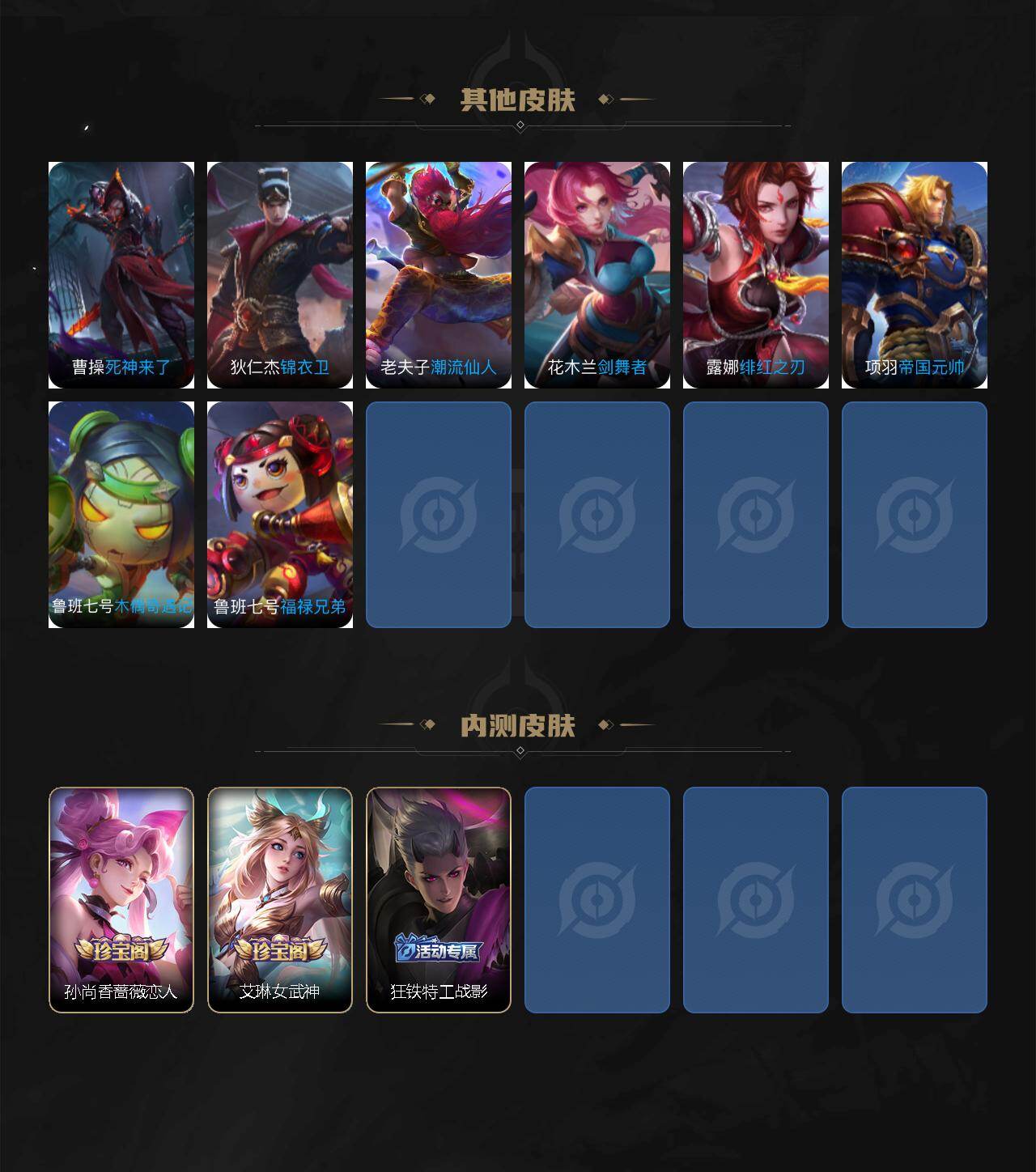 【限定皮肤】:杨戬破阵退雄兵,狄仁杰阴阳师,赵云皇家上将,嬴政白昼王子,孙尚香蔷薇恋人,鲁班七号狮舞东方,钟无艳超时空战士,芈月重明,吕布猎兽之王,夏侯惇朔风刀,甄姬游园惊梦,甄姬落雪兰心,曹操烛龙,典韦穷奇,狄仁杰魔术师,狄仁杰万华元夜,达摩沙漠行僧,