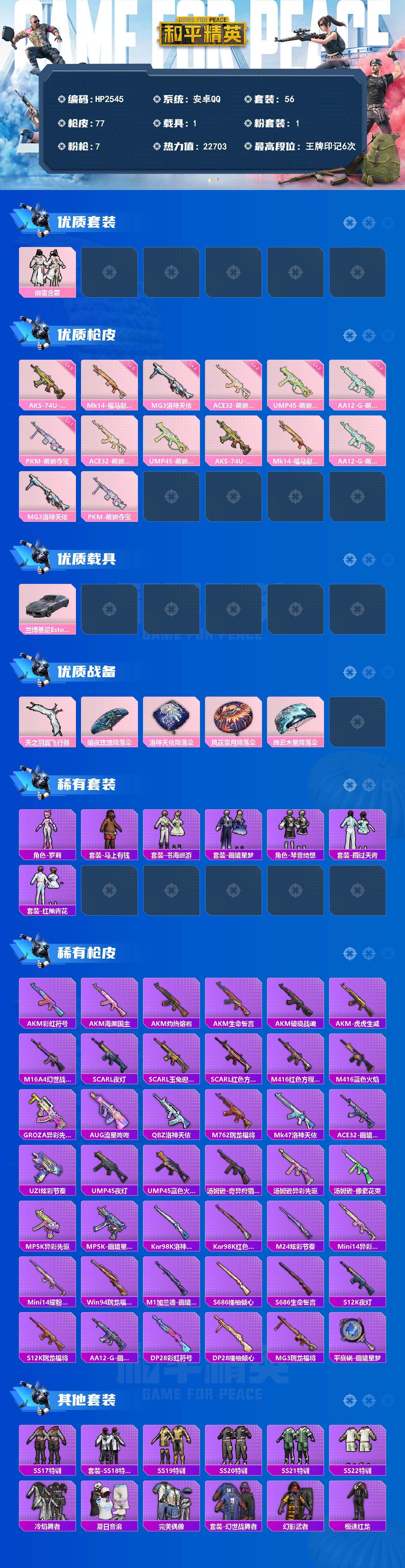 【HP2545】56套装/枪械7/装备79/载具1/战备59/王牌印记6/热力值22703/二级ACE32-萌骑漫游/二级UMP45-萌骑冒险/五级AKS-74U-森灵之息/五级Mk14-福马献瑞/二级AA12-G-萌骑幻想/二级MG3-洛神天依/一级PKM-萌骑夺宝/粉装-俏雪含霜/兰博基尼Estoque(银翼灰)/ACE32-萌骑漫游/UMP45-萌骑冒险/AKS-74U-森灵之息/Mk14-福马献瑞/AA12-G-萌骑幻想/MG3-洛神天依/PKM-萌骑夺宝/天之羽翼飞行器/暗夜玫瑰降落伞
