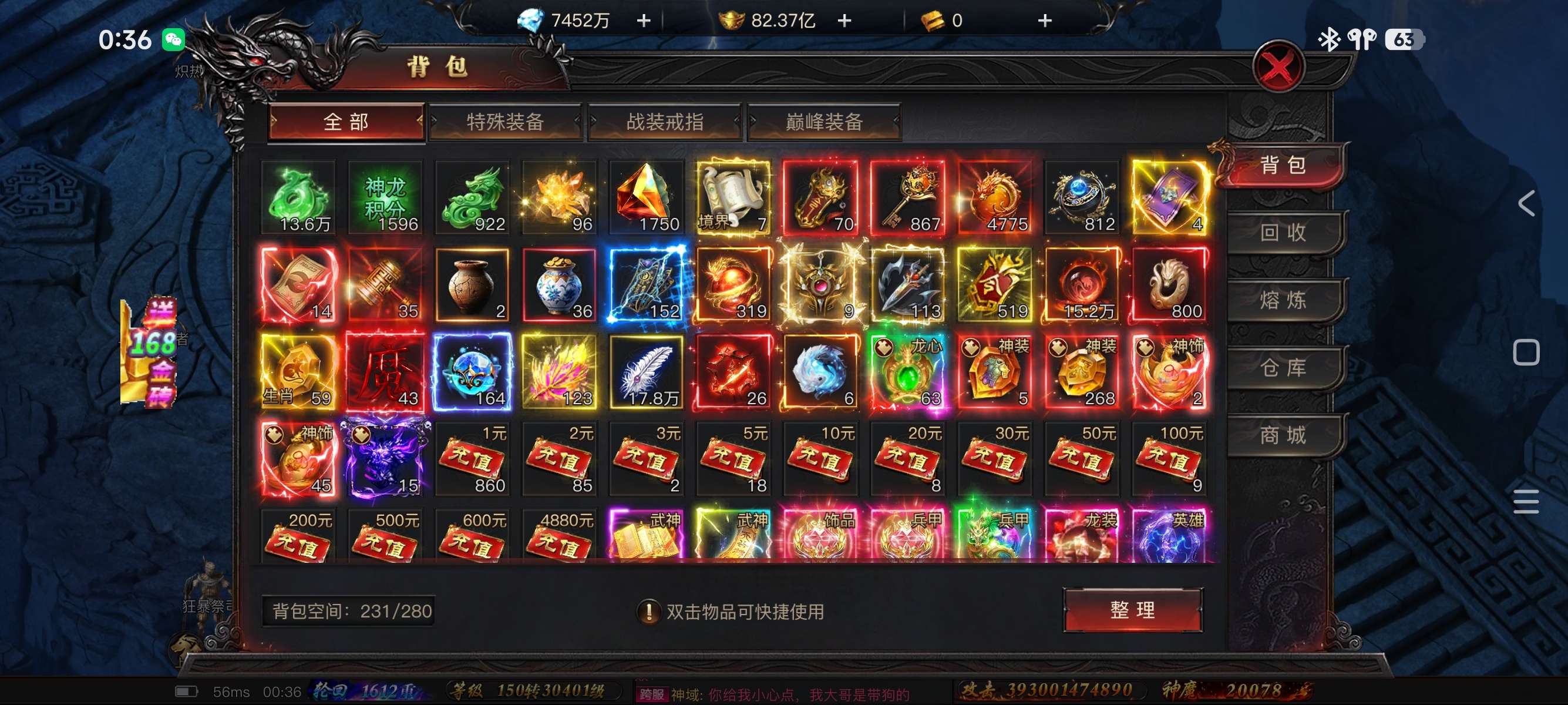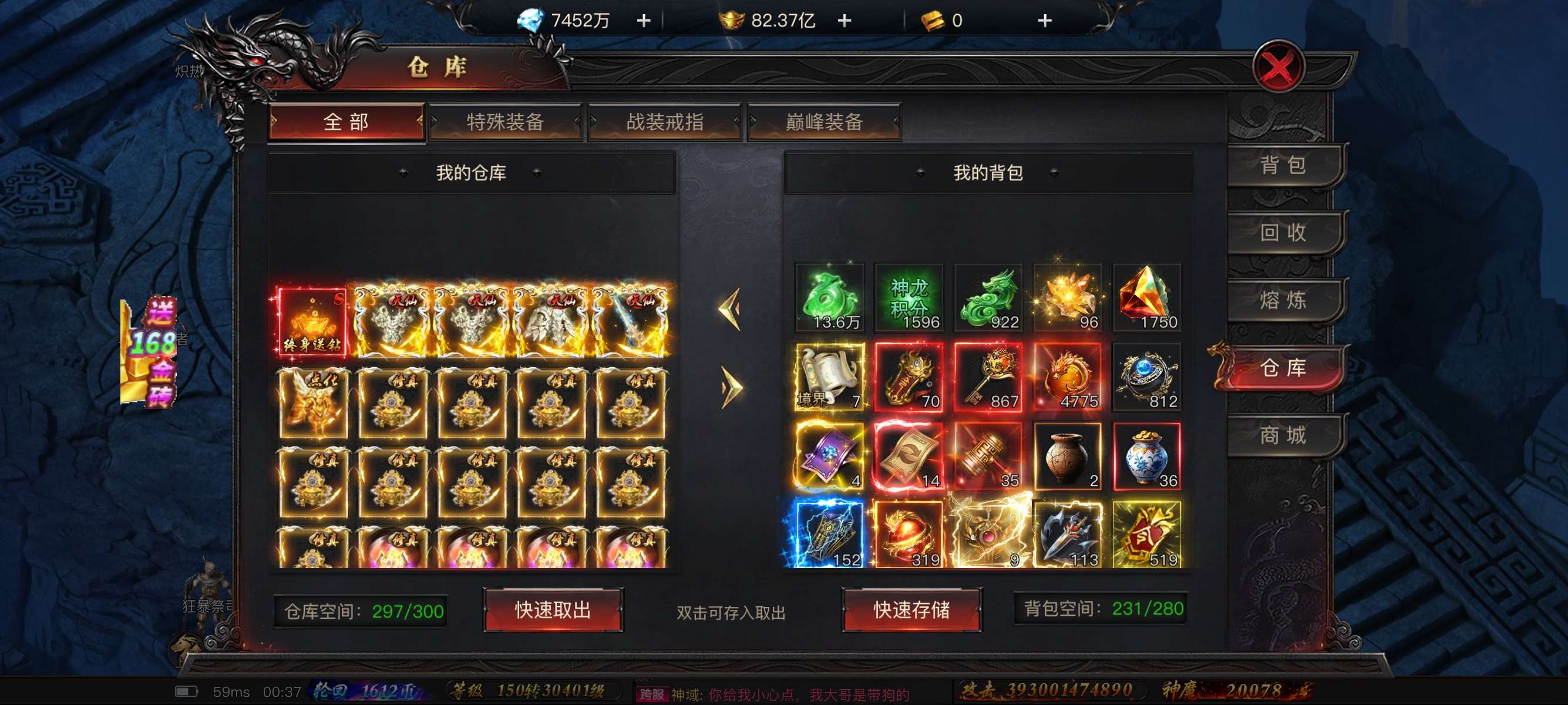 仓库东西满满,自己点,还有4700颗龙珠许愿石