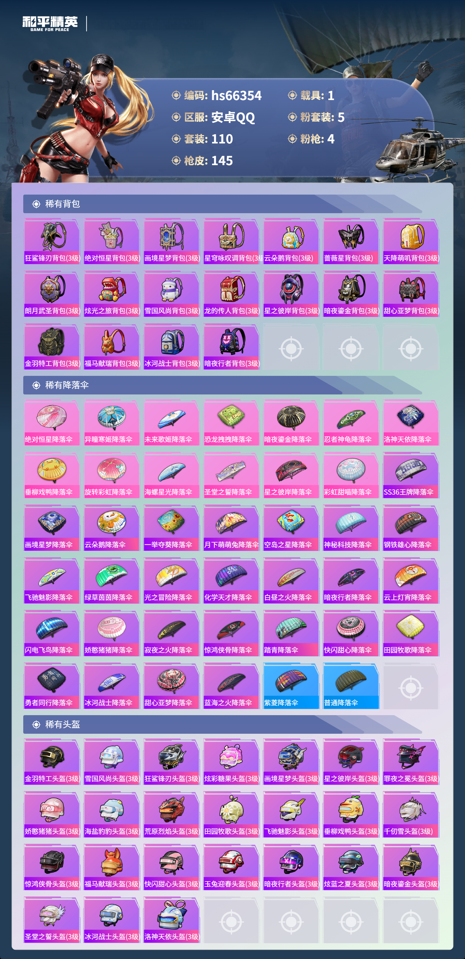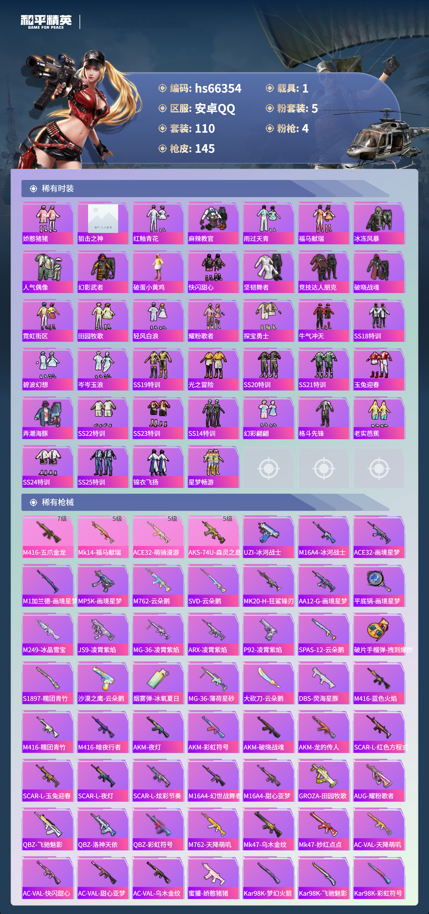 hs66354 安卓手Q-2王牌印记-5粉装-4特效枪-1载具-44343热力值-110套装-145枪皮-1卓越印记-1传奇印记