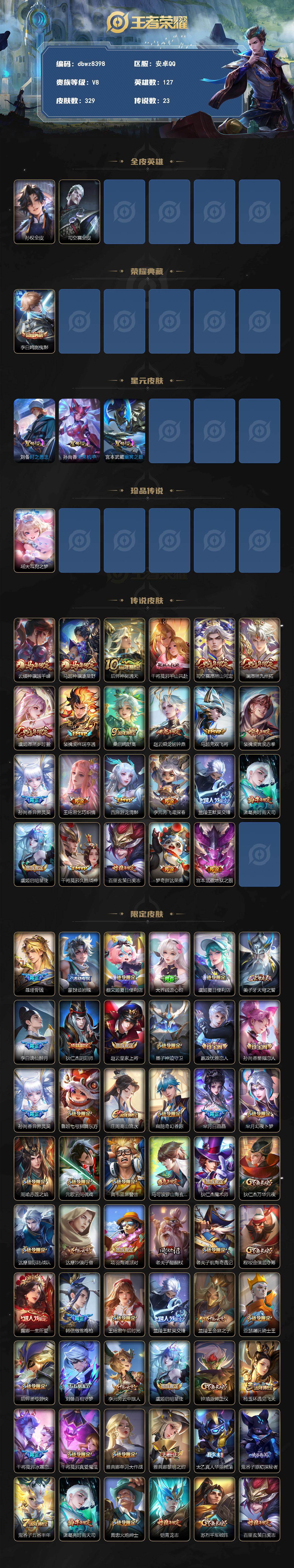 【商品标题】:安卓Q-无二次-V8(58181分)-329皮-1典藏-1珍品传说-23传说-13237场-9按键-【最新段位以实际为准,截图仅供参考】