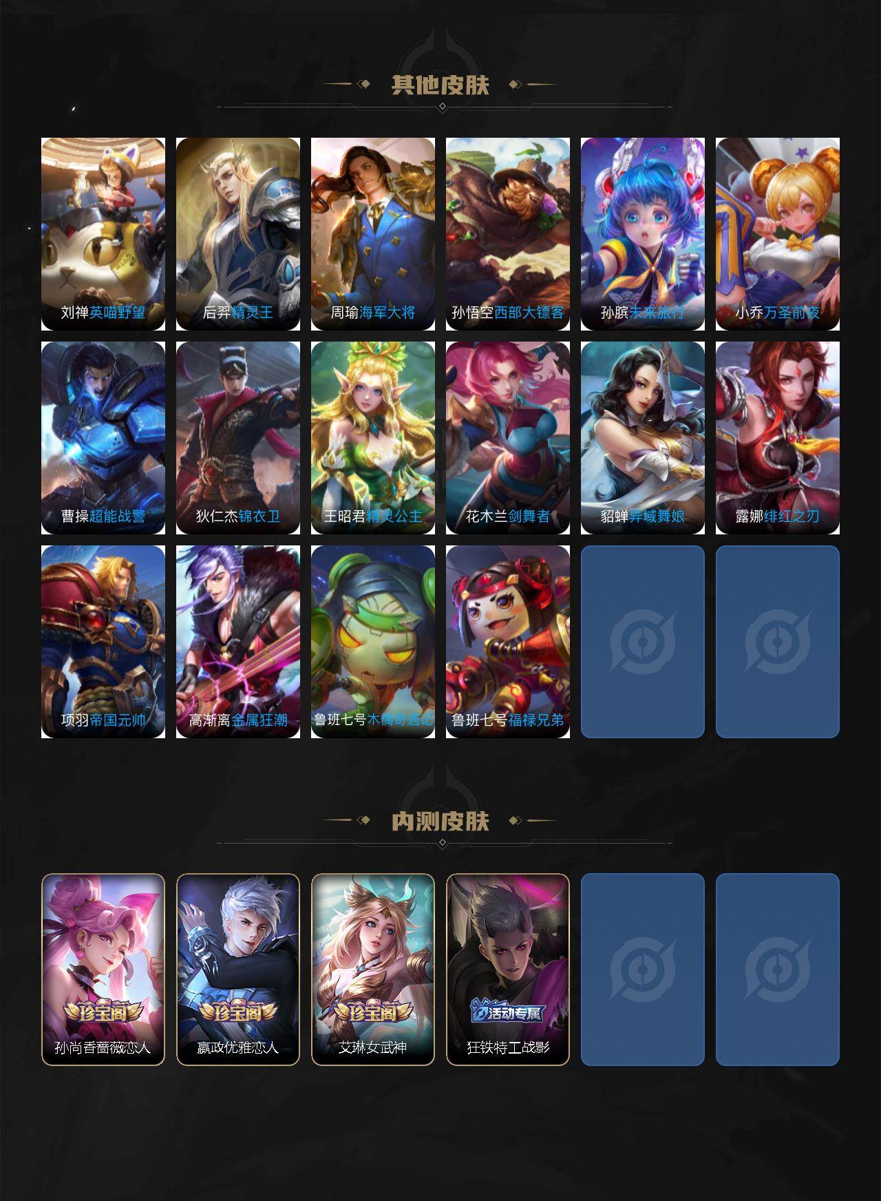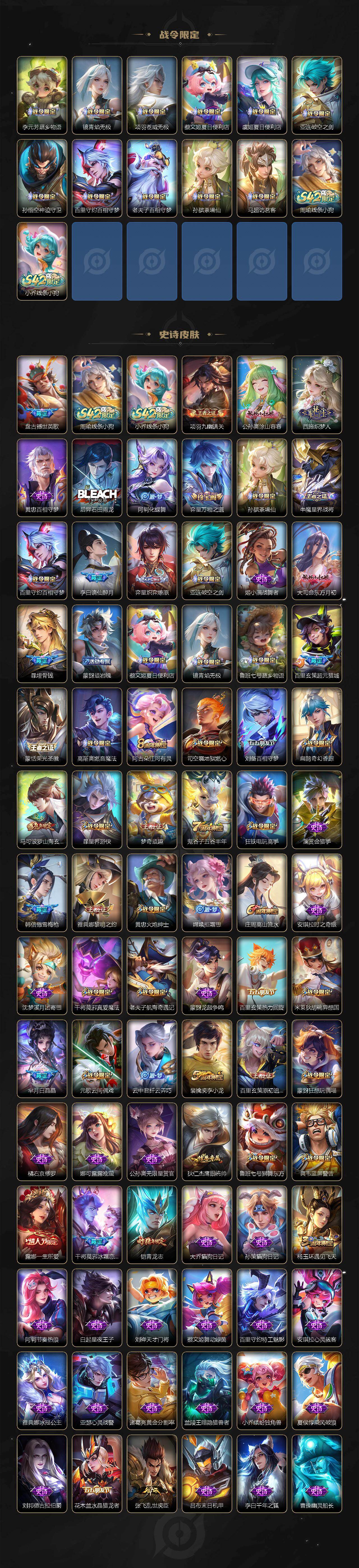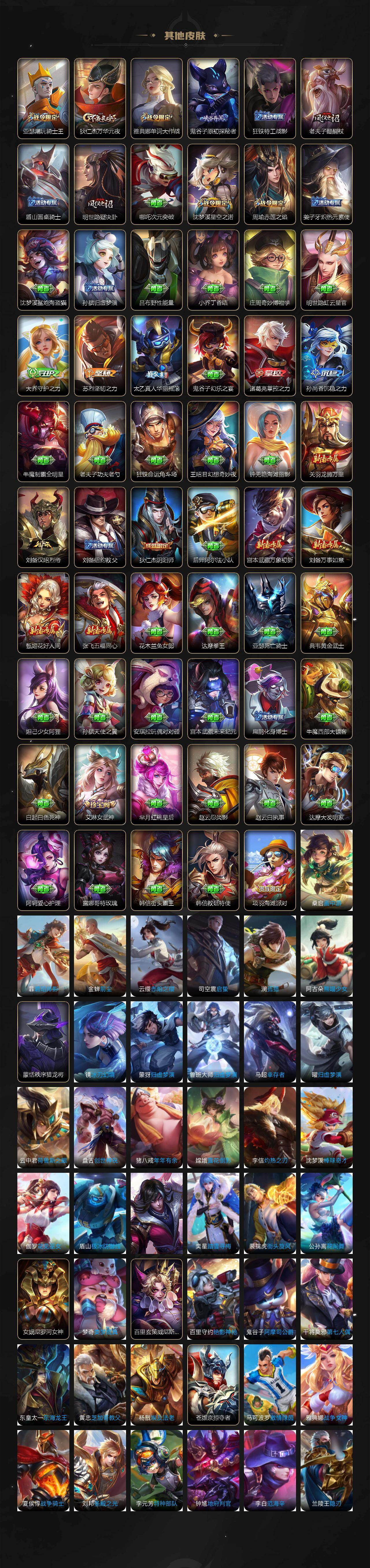 【传说皮肤】:云缨神骥越千峰,马超神骥逐星野,后羿神树通天,干将莫邪千山共赴,司空震愿照山河定,澜愿照九州拓,虞姬愿照岁时盈,裴擒虎祥瑞亨通,桑启鸣野蒿,赵云乘龙铭钟鼎,马超无双飞将,裴擒虎寅虎赤拳,孙尚香异界灵契,王昭君乞巧织情,西施游龙清影,李元芳飞鸢