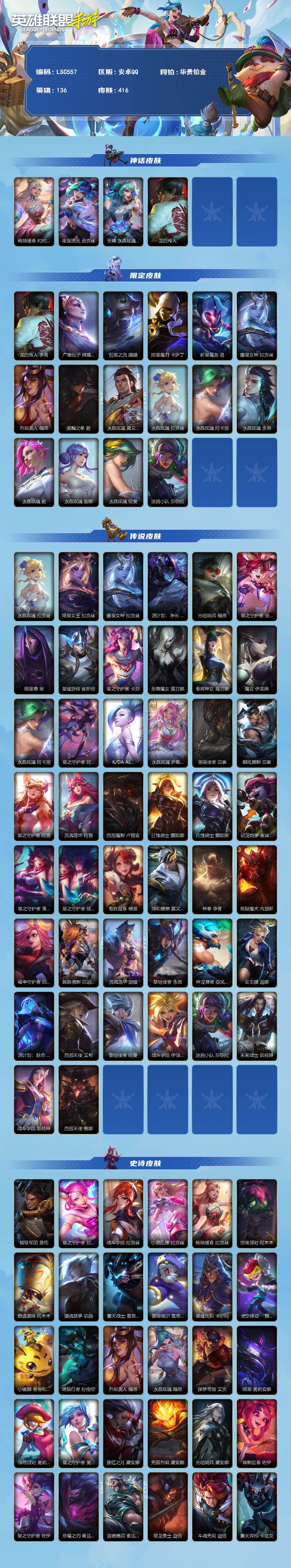 【LSC557】136英雄/416皮肤/华贵铂金/桃映暖春 灼灼芳菲 拉克丝/夜星流火 金克丝/至臻 水晶玫瑰 格温/龙的传人 李青/广寒仙子 嫦娥 黛安娜/创星之灵 璐璐/掠星魔刃 卡萨丁/斩星魔剑 易/耀星女神 拉克丝/烈焰美人 薇恩/虎痴之拳 蔚/水晶玫瑰 嘉文四世/水晶玫瑰 拉克丝/水晶玫瑰 阿卡丽/水晶玫瑰 永恩/水晶玫瑰 蔚/水晶玫瑰 娑娜/水晶玫瑰 锐雯/涂鸦小队 莎弥拉/暗星女王 拉克丝/源计划:净化 薇恩/光明哨兵 薇恩/星之守护者 金克丝/暗星尊 烬/星域游侠 崔斯特/星之守