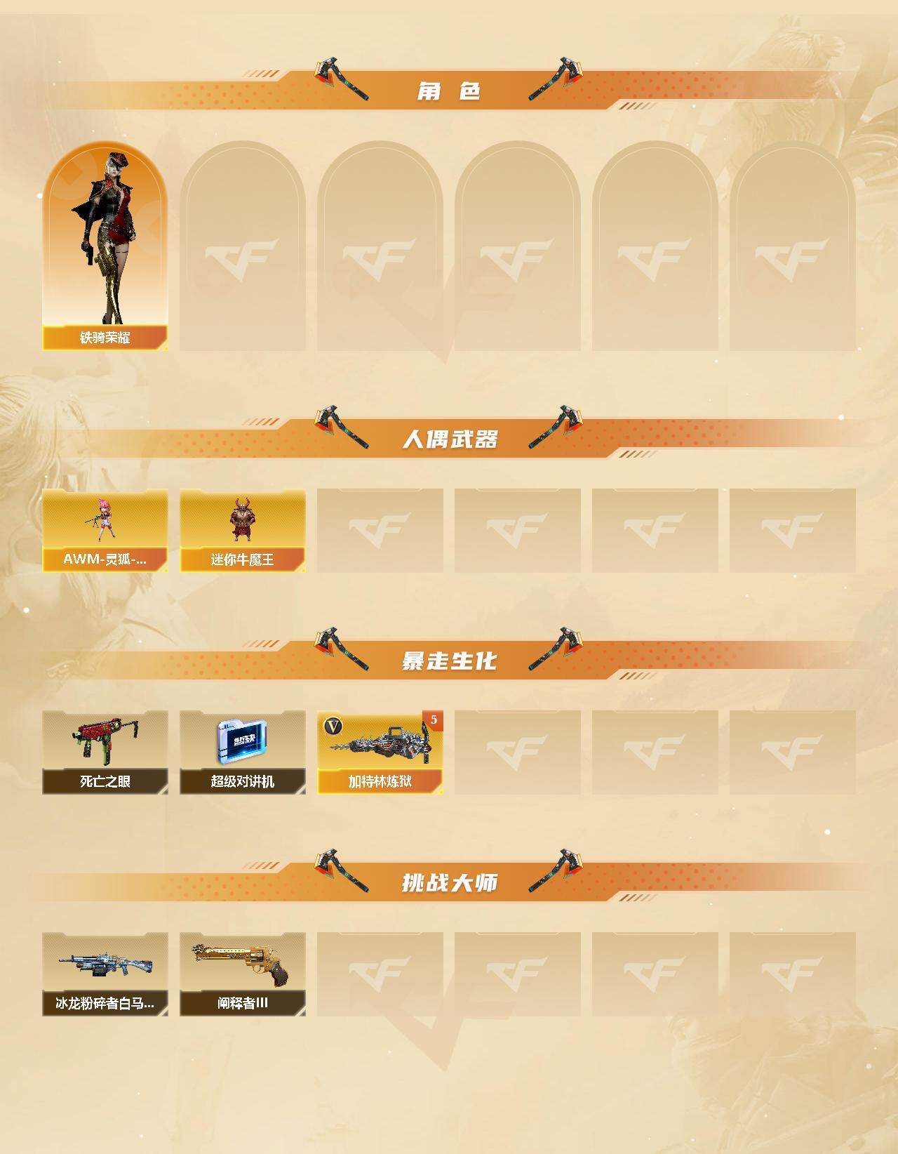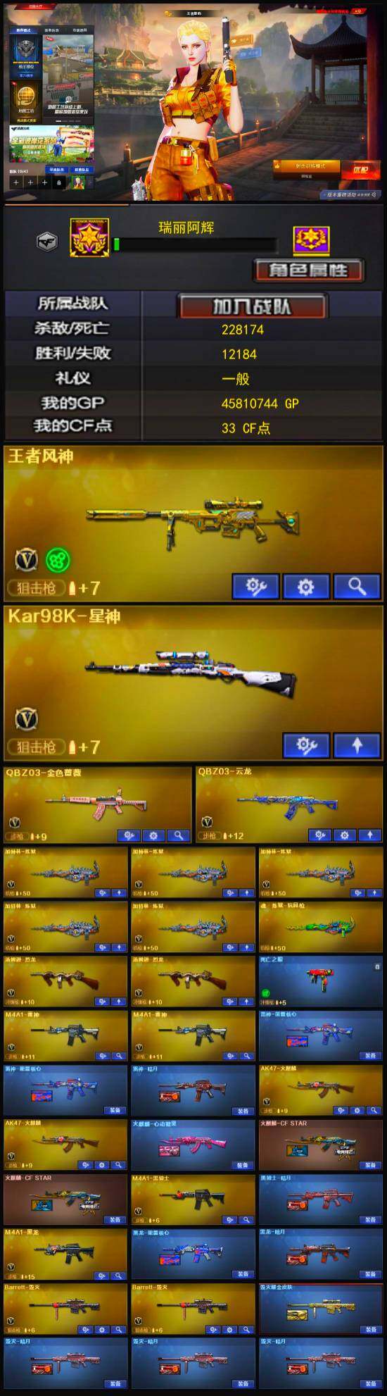 【ylw-cf2130】云南一区-58V-6王者-0炫金【热门武器】:QBZ03-金色蔷薇,死亡之眼,Kar98K-星神,M4A1-黑骑士,汤姆逊-烈龙*2,加特林-炼狱*5,沙鹰-修罗*6【稀有皮肤】:雷神-能量核心*2,火麒麟-心动糖果,黑骑士-暗月,毁灭-暗月*3,毁灭耀金皮肤【角色】:王者影豹,王者潘多拉,零-水下丽影,灵狐者-职业经理,葵,魅影,铁骑荣耀【人偶武器】:AWM-灵狐-15周年嘉年华,迷你牛魔王【暴走生化】:死亡之眼,超级对讲机【挑战大师】:阐释者III,冰龙粉碎者-白马银