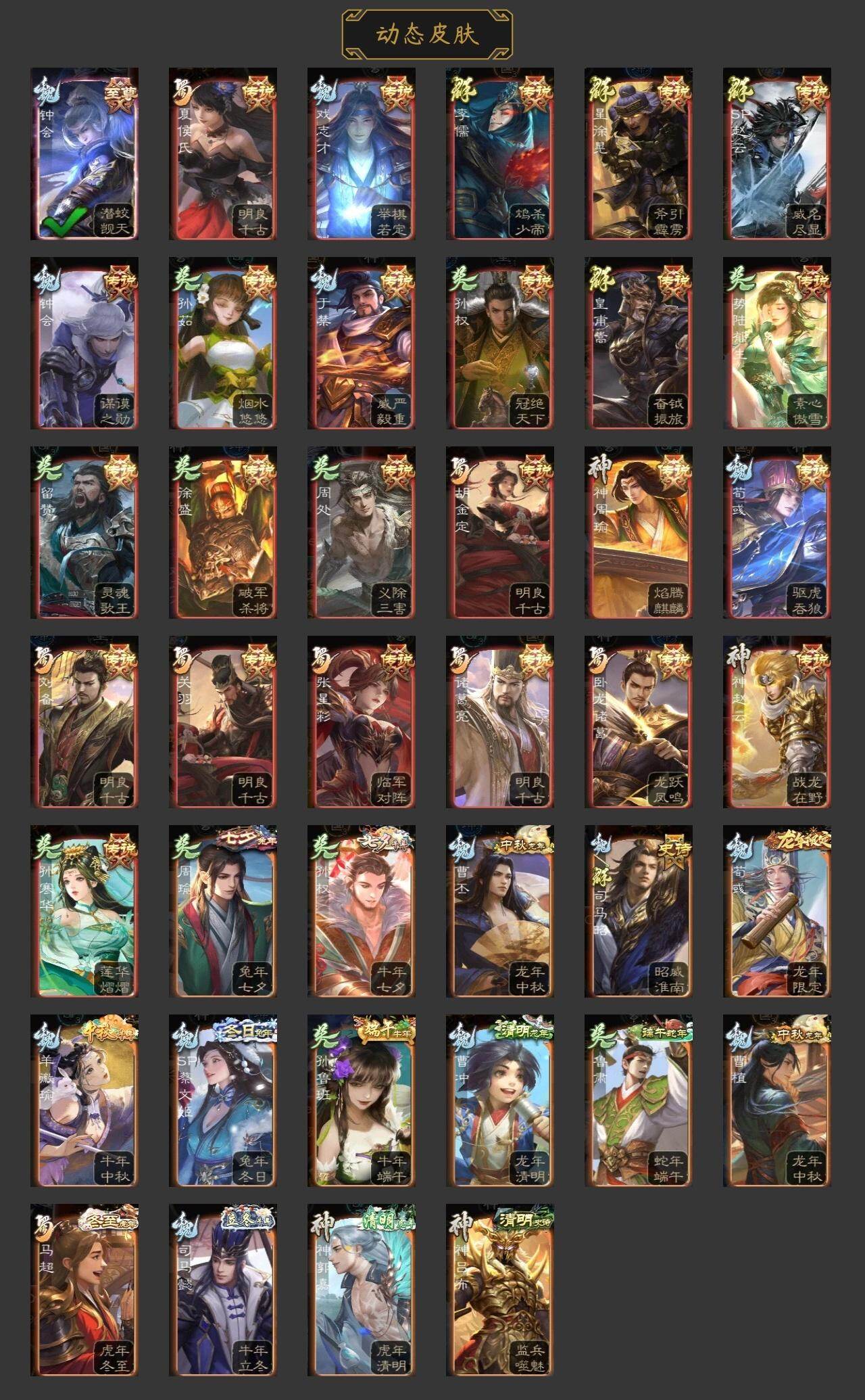 神吕布,神赵云,神张辽,神郭嘉,神诸葛亮,星周不疑,王粲,杨修,王元姬,界钟会,界于禁,郝昭,陈琳,曹纯,戏志才,程昱,关索,谋黄忠,谋赵云,谋马超,诸葛瞻,赵襄,张星彩,沙摩柯,谯周,界黄忠,花鬘,吴景,孙寒华,骆统,留赞,界朱然,界徐盛,贺齐,裴秀,左慈,星黄忠,陶谦,审配,