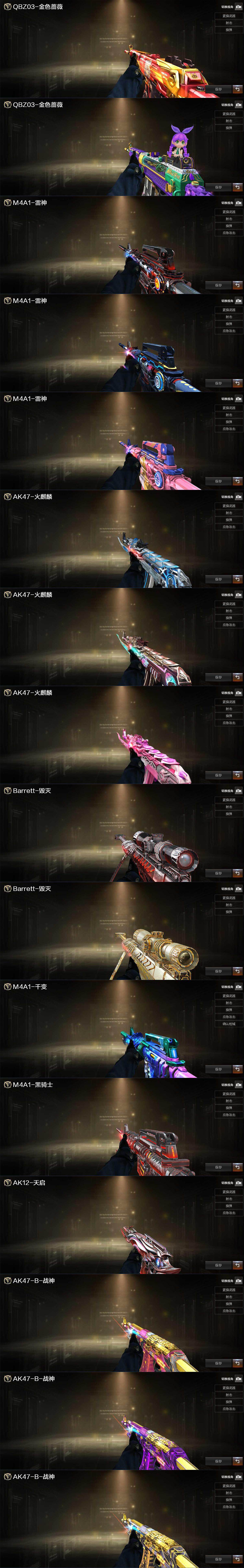 【热门武器】:传说辉光,QBZ03-金色蔷薇,M200-幻神,M200-竞技荣光,白虎-电玩蓝兔,Kar98K-星神,M4A1-黑骑士,加特林-炼狱,毁灭-孙三炮,USP-雷暴,沙鹰-修罗,炽芒蝶刃