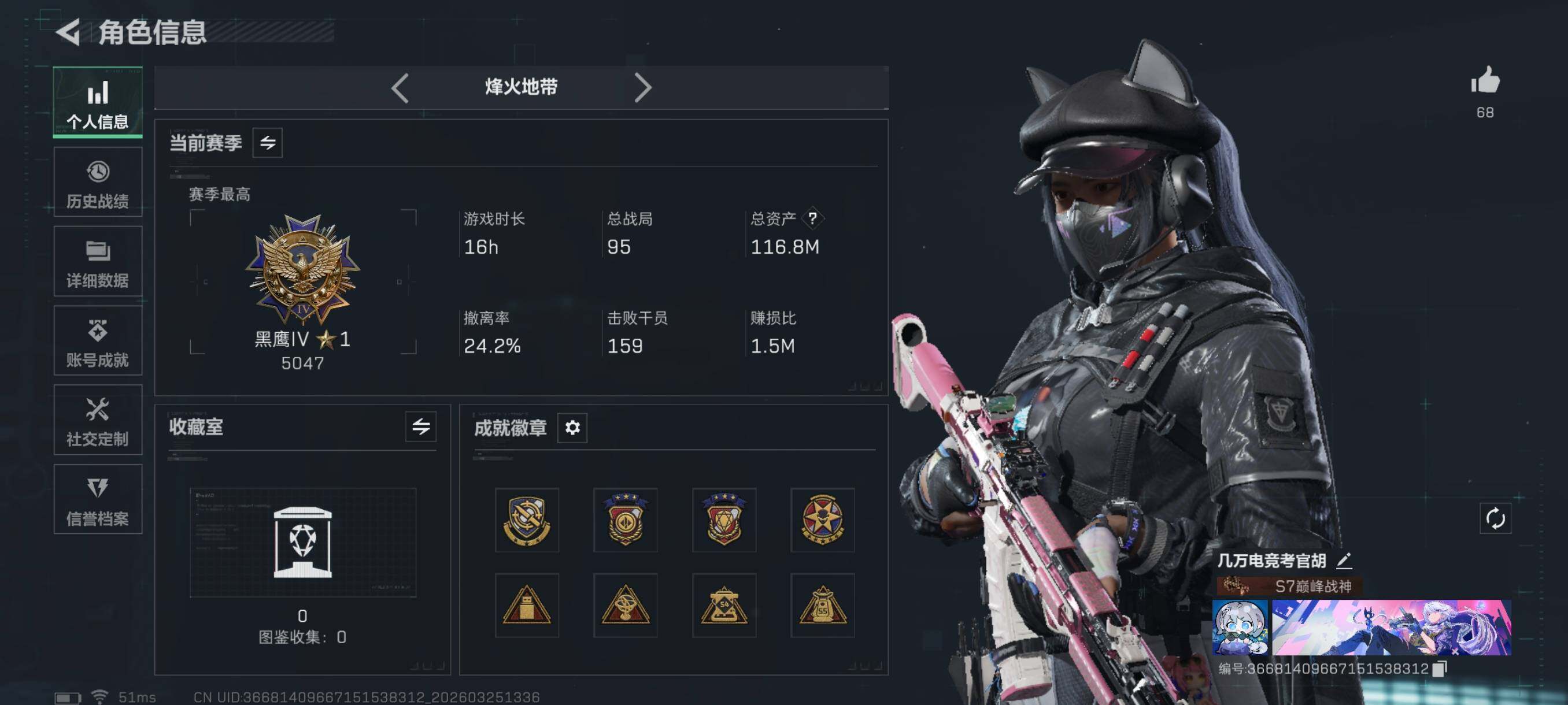 {特价出售}等级:60总资产:116.8M 纯币431827 隐藏挂饰: 2S毁灭之源 红皮:飞虎 露娜联动 骇爪联动 刀皮: 北极星 砖皮: 气象腾龙优品A 特勤处:仓库满,训练满,靶场满部门44444