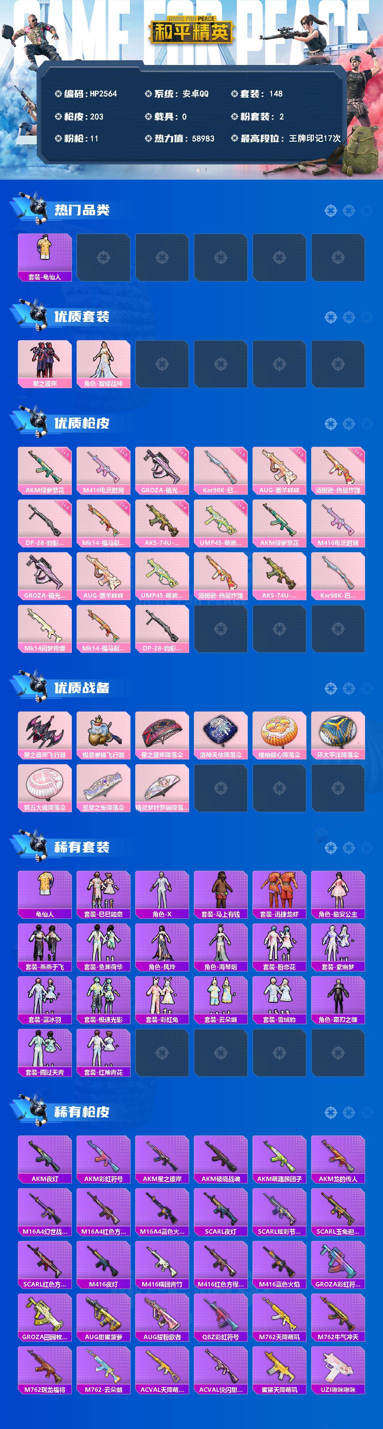 【HP2564】148套装/枪械11/装备219/战备154/王牌印记17/热力值58983/五级AKM-绿萝繁花/五级M416-电玩时刻/五级GROZA-镜光银凌/五级AUG-暖羊咩咩/四级UMP45-萌骑冒险/五级汤姆逊-热量炸弹/四级AKS-74U-森灵之息/五级Kar98K-巳巳如意/五级Mk14-福马献瑞/五级DP-28-豹影疾电/套装-龟仙人/粉装-星之彼岸/角色-智耀战神/AKM-绿萝繁花/M416-电玩时刻/GROZA-镜光银凌/AUG-暖羊咩咩/UMP45-萌骑冒险/汤姆逊-热