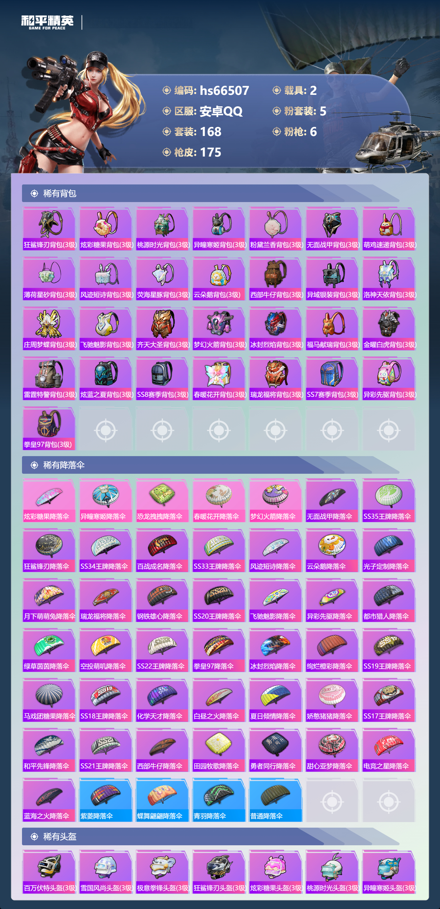 hs66507 安卓手Q-10王牌印记-5粉装-6特效枪-2载具-59257热力值-168套装-175枪皮-1卓越印记
