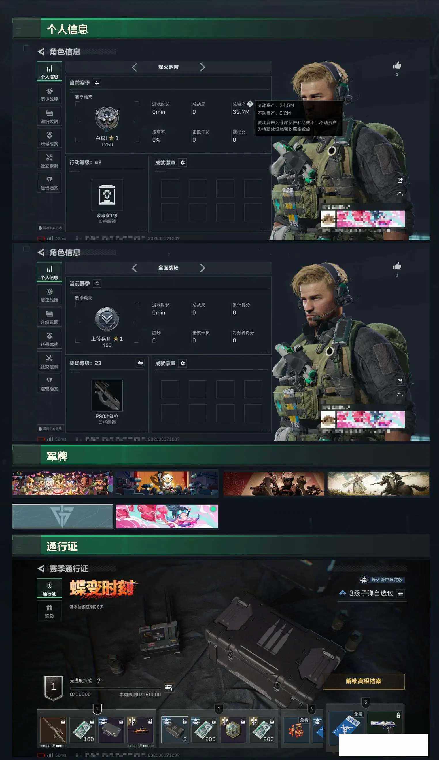 【sjs9121】怜悯+维什戴尔+总资产39.8m 精品单刀单红账号可二次 sjs9121 烽火地带段位: 白银 全面战场段位: 上等兵 总资产: 39000000 哈夫币: 13374000 干员外观: 骇爪-维什戴尔 传说武器皮肤: 近战-怜悯,SR-25射手步枪-水墨云图,R93狙击步枪-维什戴尔,SCAR-H战斗步枪-启航,ASh-12战斗步枪-鹅鸭杀,QCQ171冲锋枪-鹅鸭杀,QJB201轻机枪-鹅鸭杀 史诗武器皮肤: QBZ95-1突击步枪-ACE,AUG突击步枪-特勤执行,QSZ