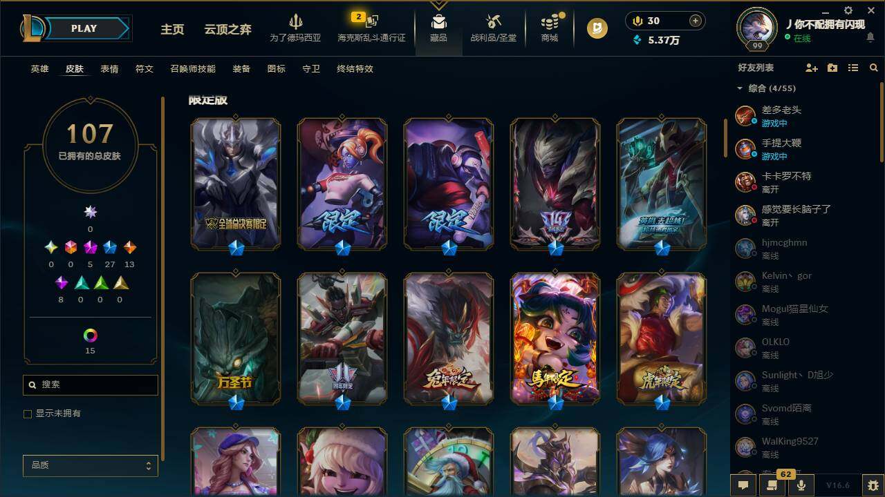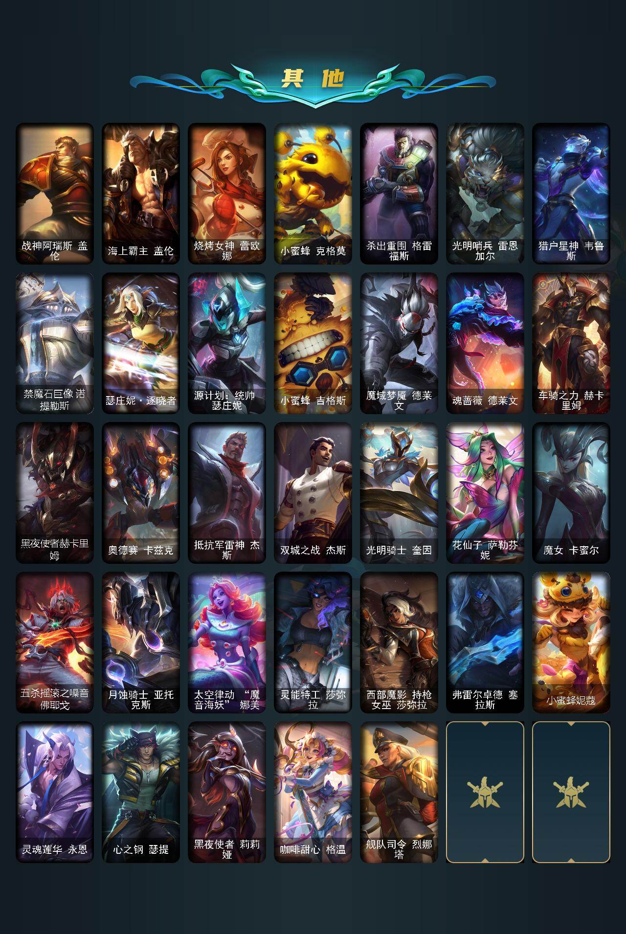 85英雄/107皮肤/5神话/27限定/9臻彩/39炫彩/13传说/8史诗/白银/