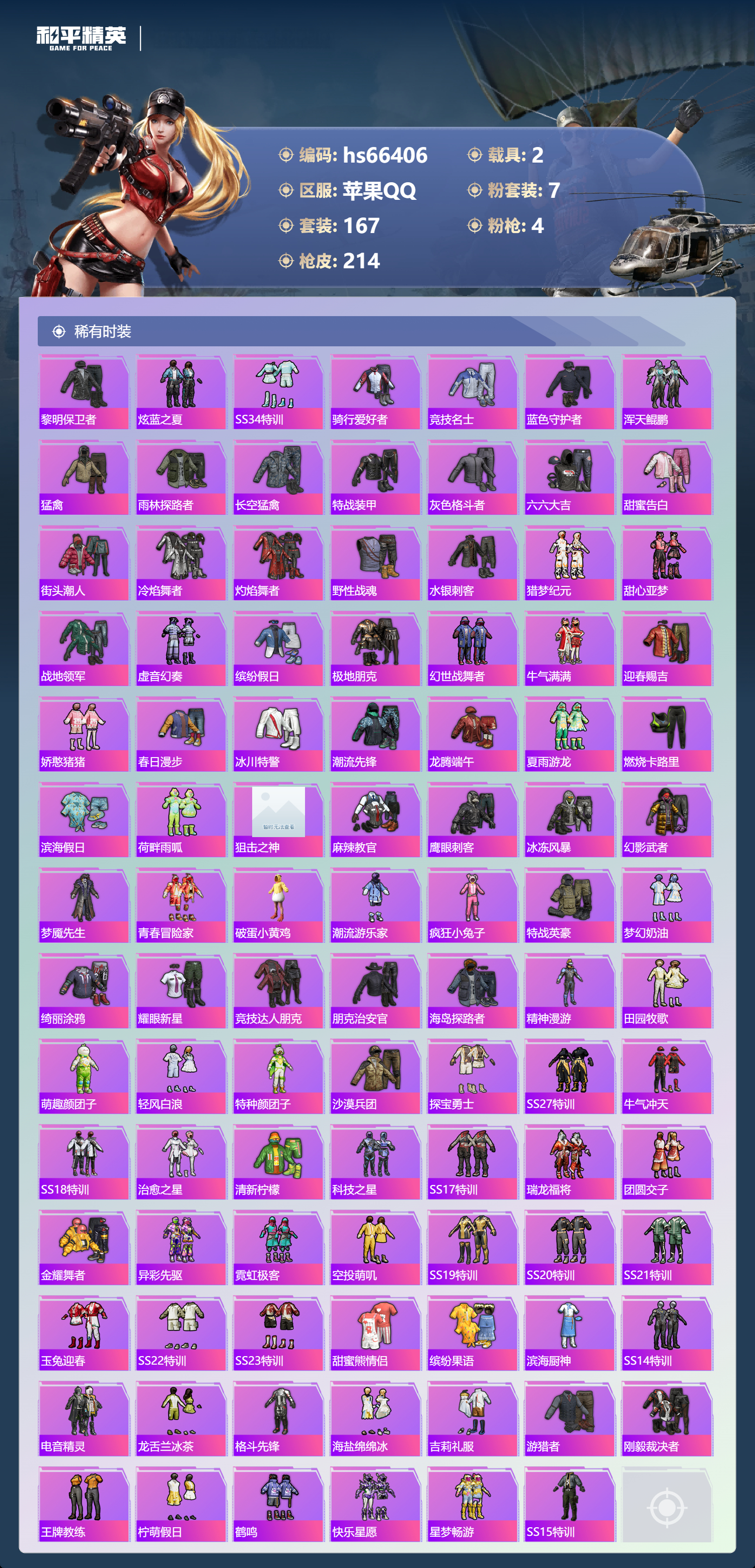 hs66406 苹果手Q-12王牌印记-7粉装-4特效枪-2载具-64894热力值-167套装-214枪皮