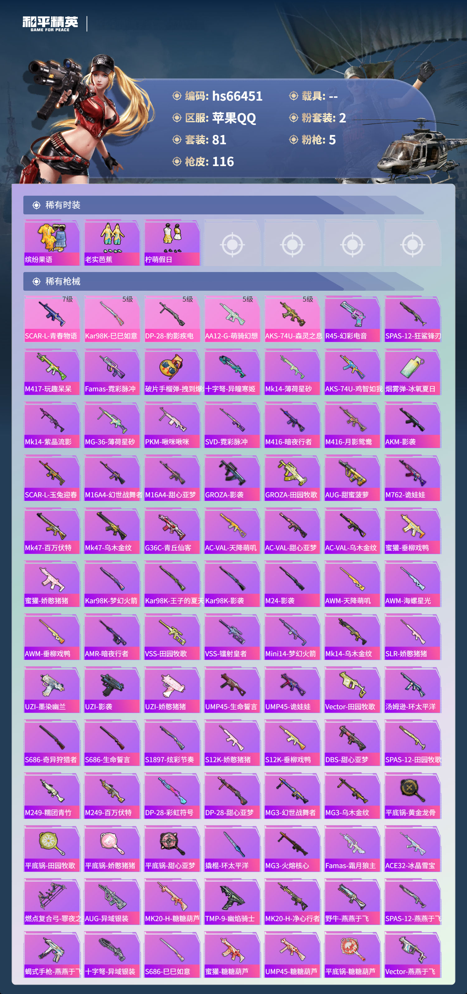 hs66451 苹果手Q-8王牌印记-2粉装-5特效枪-35402热力值-81套装-116枪皮-3卓越印记-2传奇印记