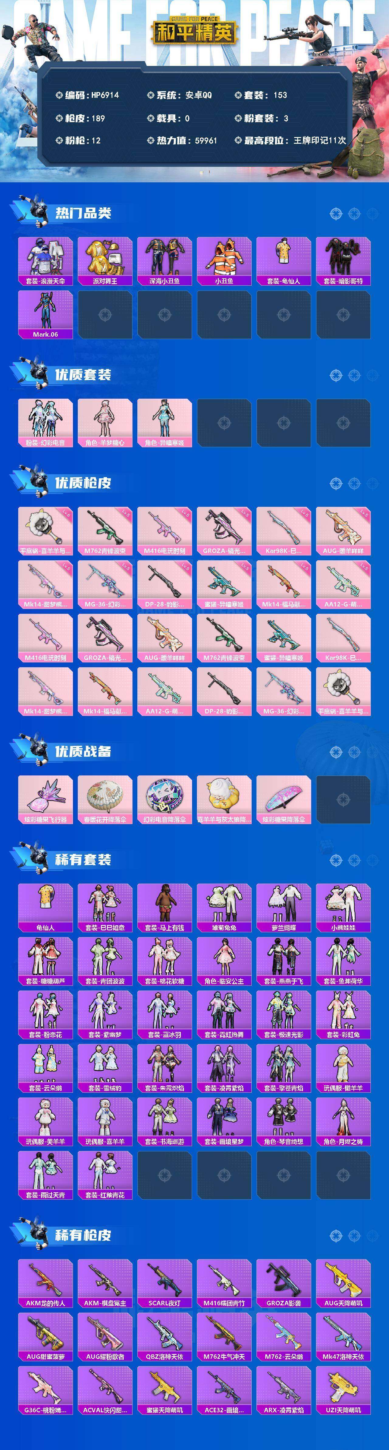 (3粉套12粉枪)地铁满天赋/幻彩电音/羊梦糖心/异瞳寒姬/浪漫天命/派对舞王/深海小丑鱼/小丑鱼/龟仙人/暗影哥特/蓝螳螂/M4电玩时刻5级/GROZA镜光银凌5级/AUG暖羊咩咩5级/M762青锋波束5级/蜜獾异瞳寒姬5级/Mk14甜梦熊击5级/AA12G萌骑幻想5级/MG36幻彩电音5级/平底锅喜羊羊与灰太狼6级/没战神框/HP6914-1粉色飞行器-59961热力值-11王牌印记-153套装-189枪皮