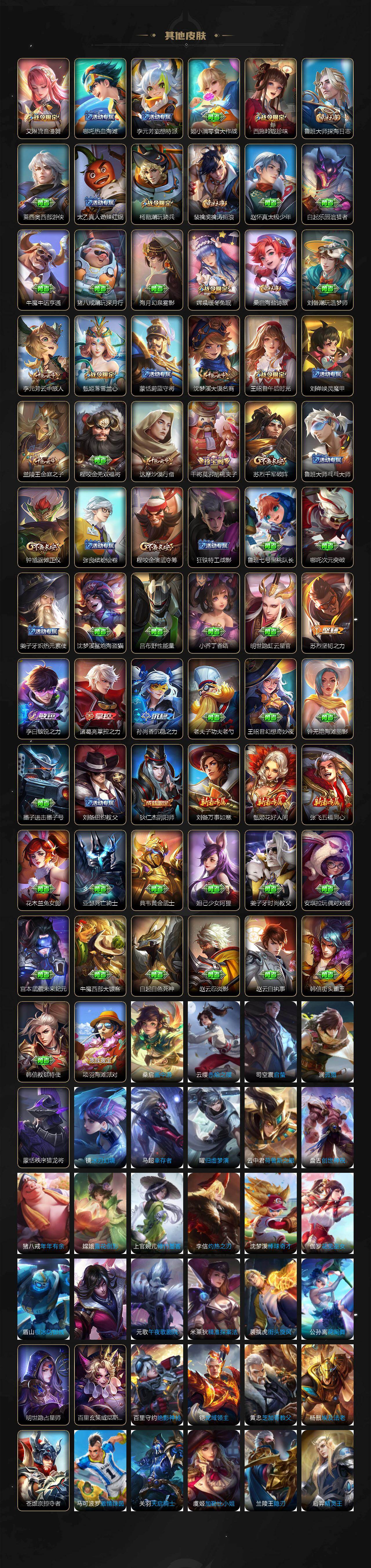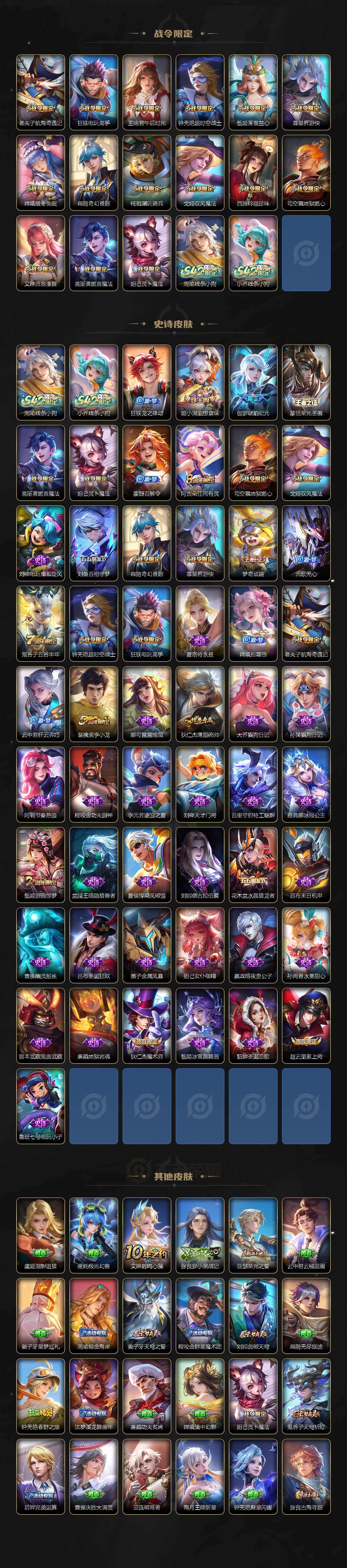 【限定皮肤】:姜子牙天穹之誓,狄仁杰阴阳师,赵云皇家上将,钟无艳超时空战士,扁鹊奇幻香踪,元歌无心,甄姬游园惊梦,甄姬落雪兰心,狄仁杰魔术师,达摩沙漠行僧,项羽海滩派对,老夫子航海奇遇记,程咬金演武夺筹,王昭君午